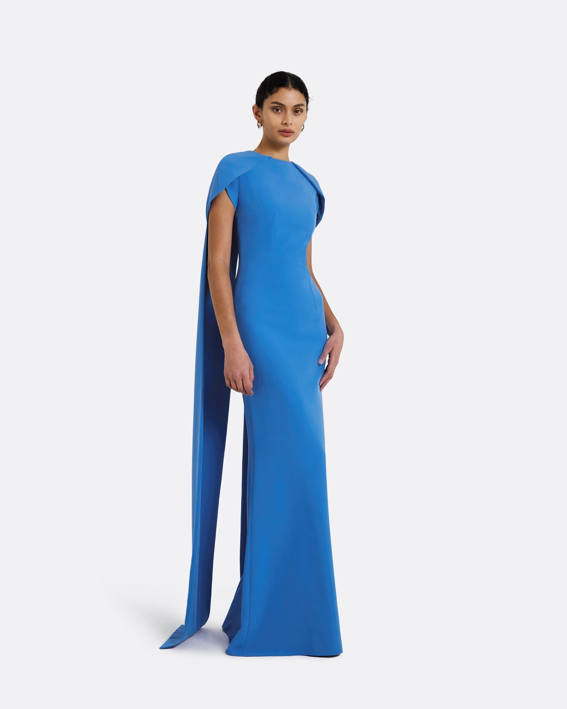 Full-length fitted short sleeve cape dress with a long tailed back with a deep split and covered buttons, in bluette.