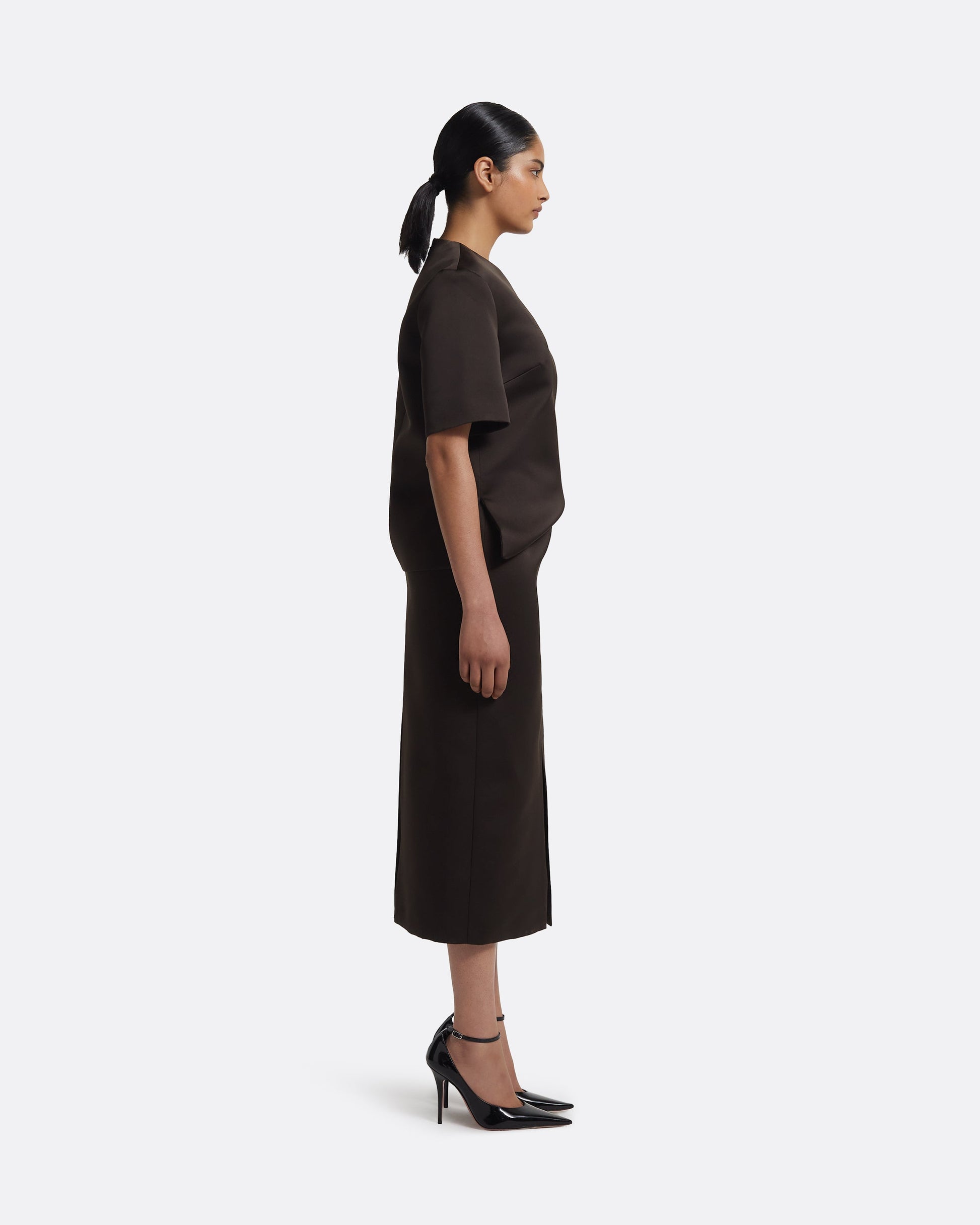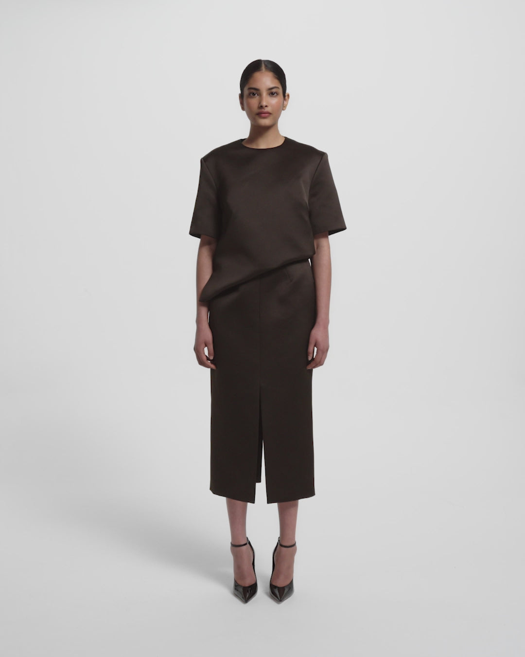 From the Autumn Winter '25 collection, the Grainee skirt in peat brown balances movement and structure. Designed with directional slits, it reimagines classic tailoring with a subtle sense of flow.