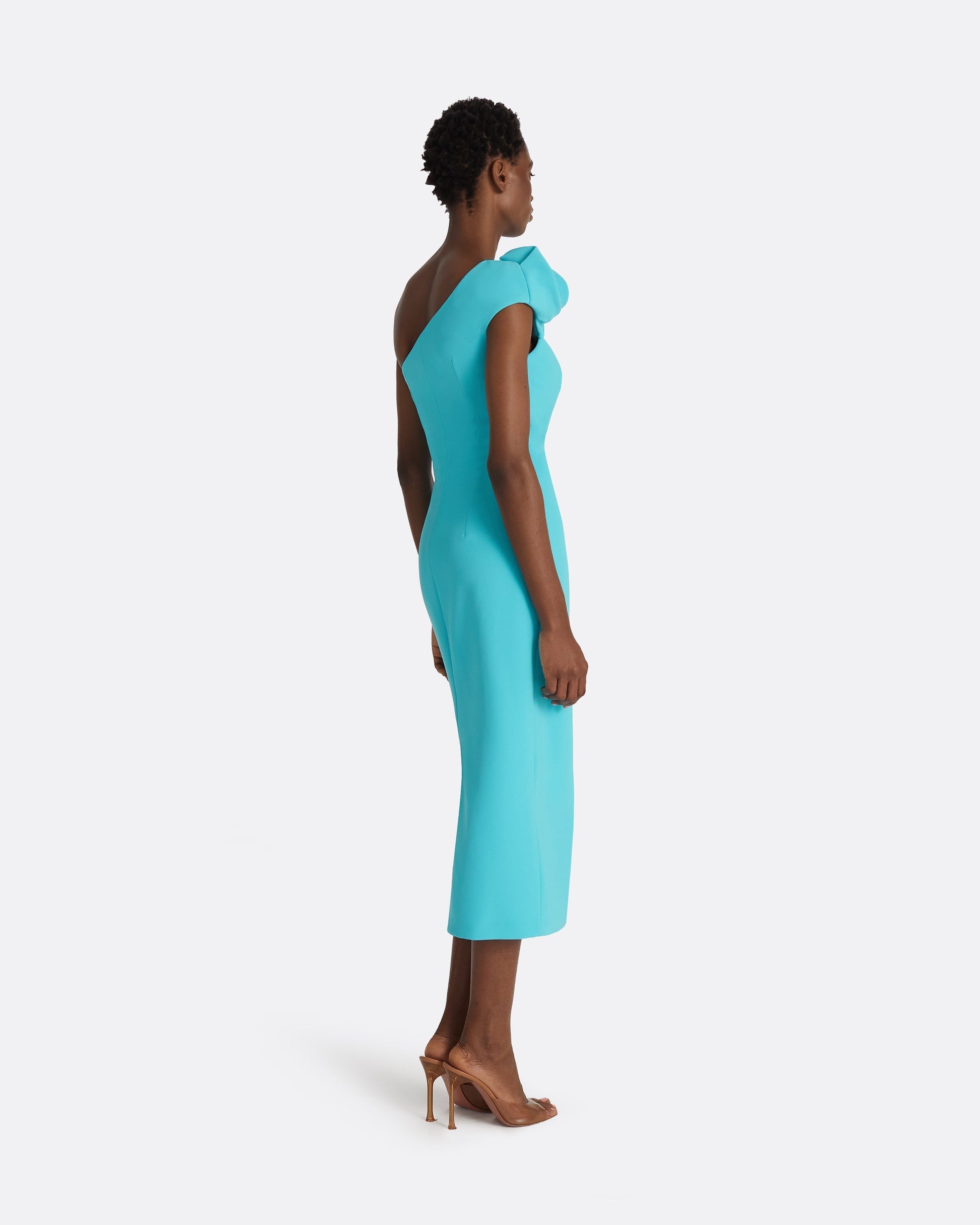Cocktail dress with pleated bodice drape in aquamarine Heavy Crepe.