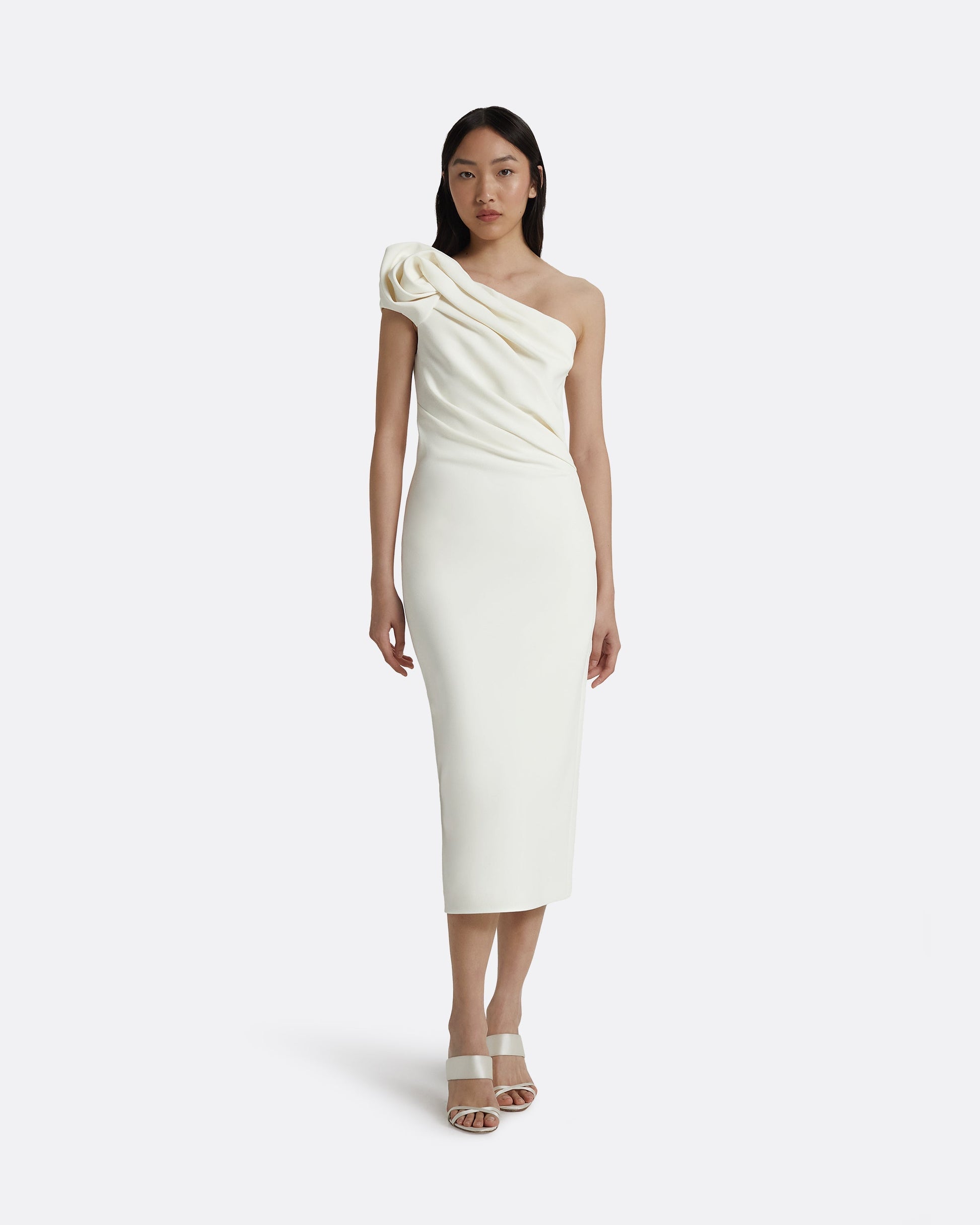 Cocktail dress with pleated bodice drape in ivory Heavy Crepe.