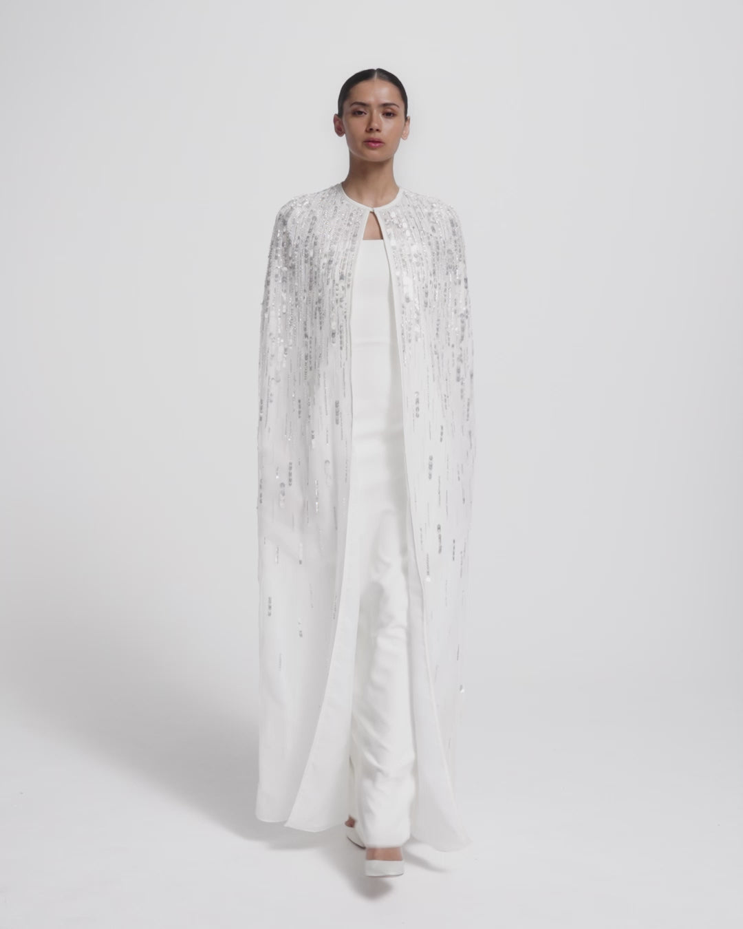 From the Bridal ’26 collection, the Greta cape in ivory brings a dramatic layer to occasion dressing. Its sweeping length and crystal accents frame the look with presence and luminosity.