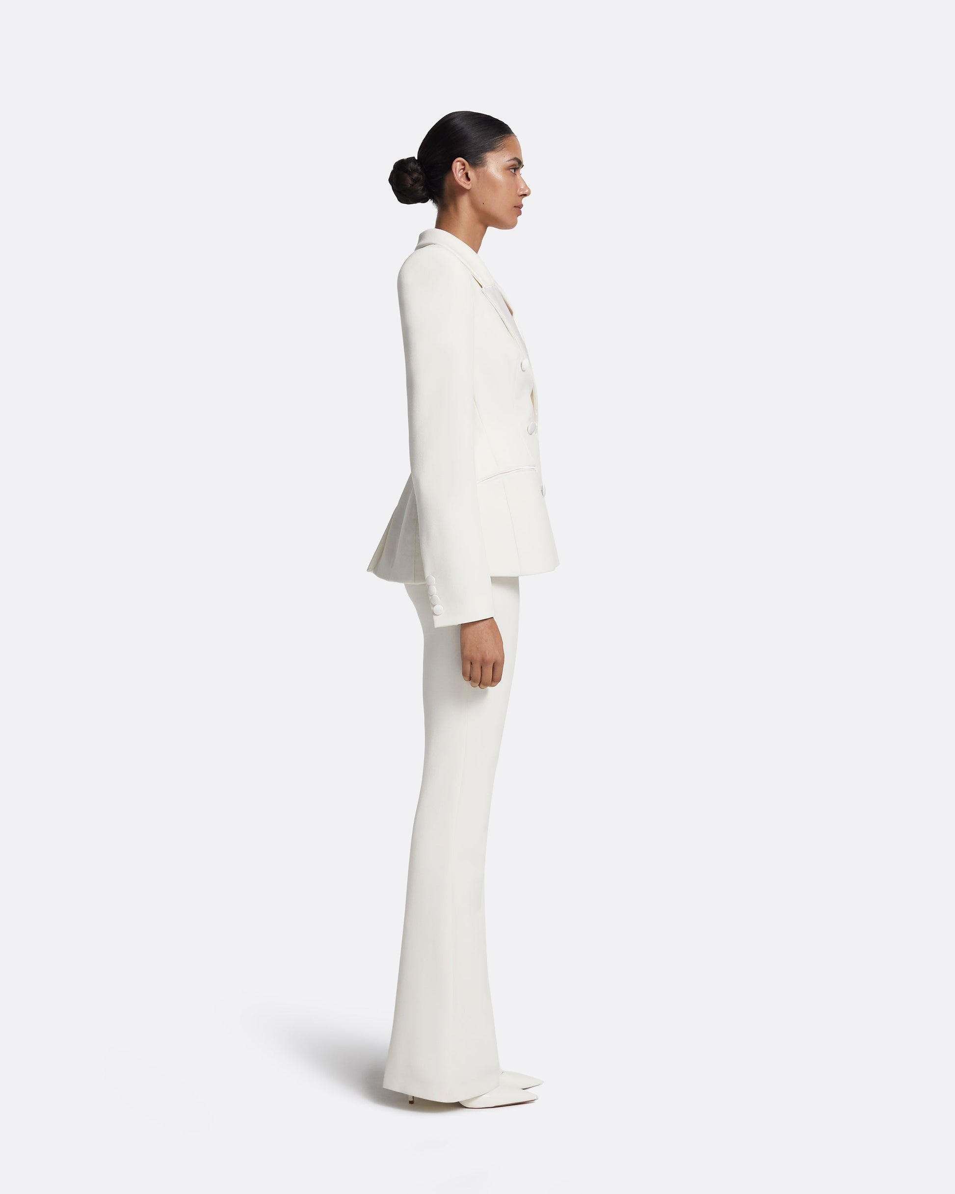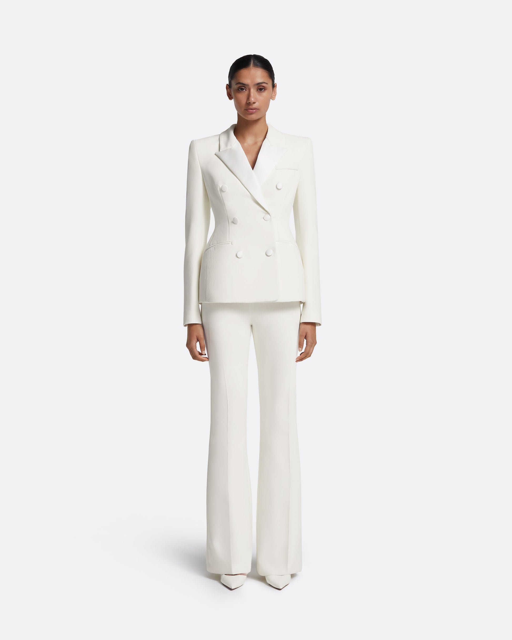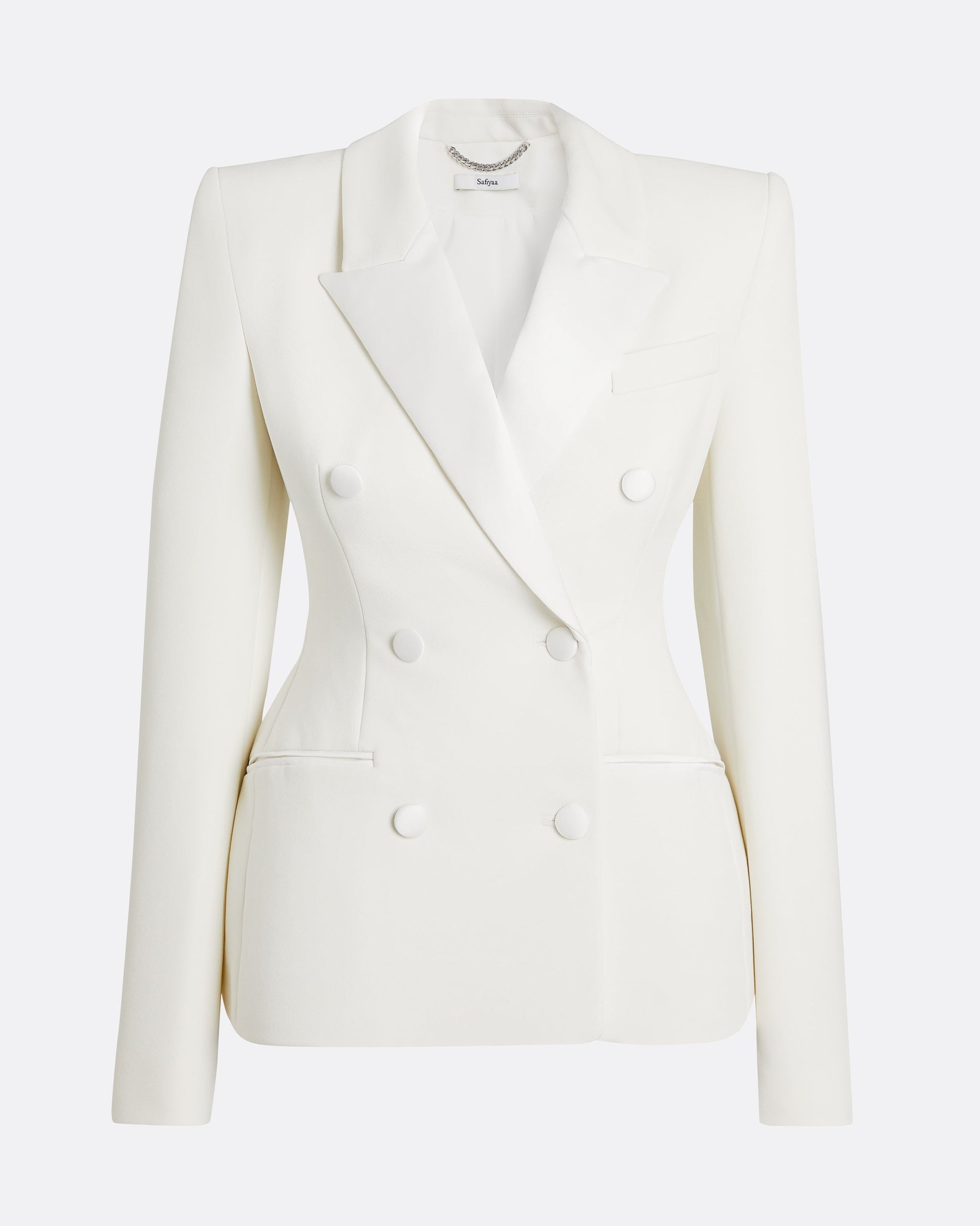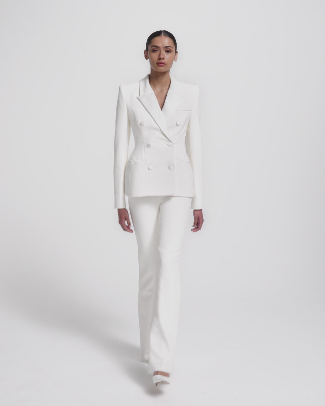 From the Bridal ’26 collection, the Gulsen jacket in porcelain on ivory channels a commanding silhouette through sharp tailoring and bold proportion. Designed to define, it brings modern structure to power dressing.