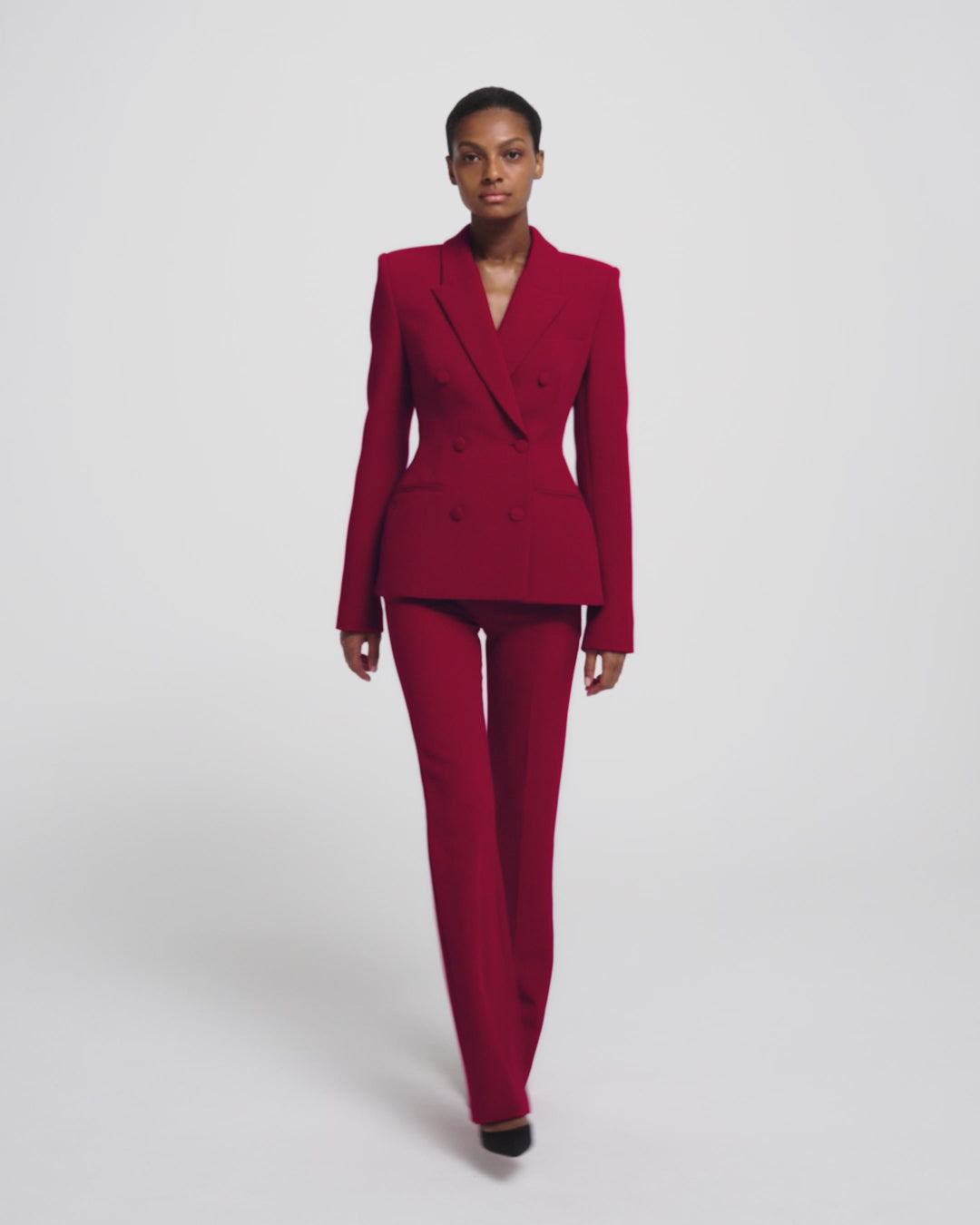 Wide shouldered, double breasted blazer in azalea red Heavy Crepe and Tech Duchess.