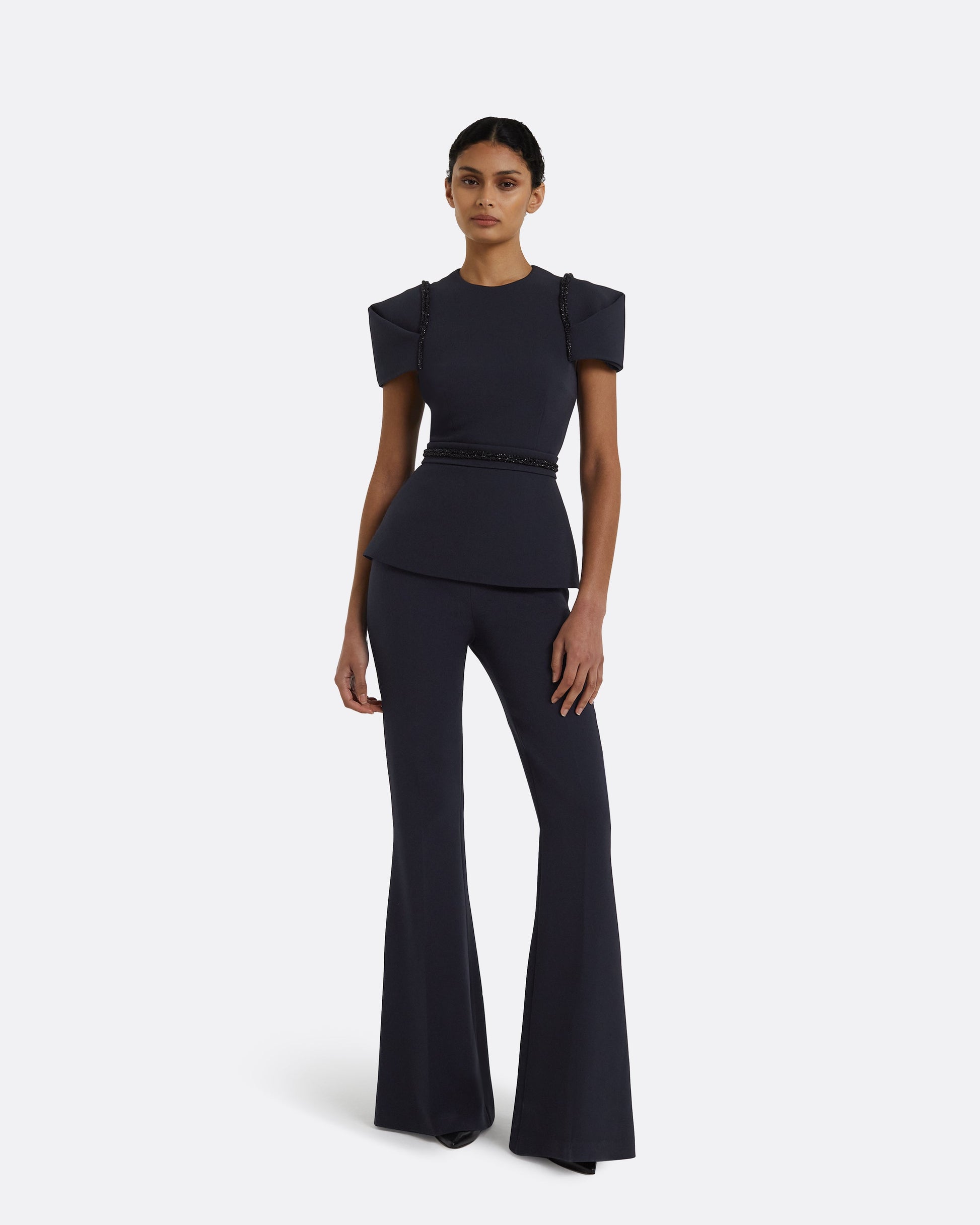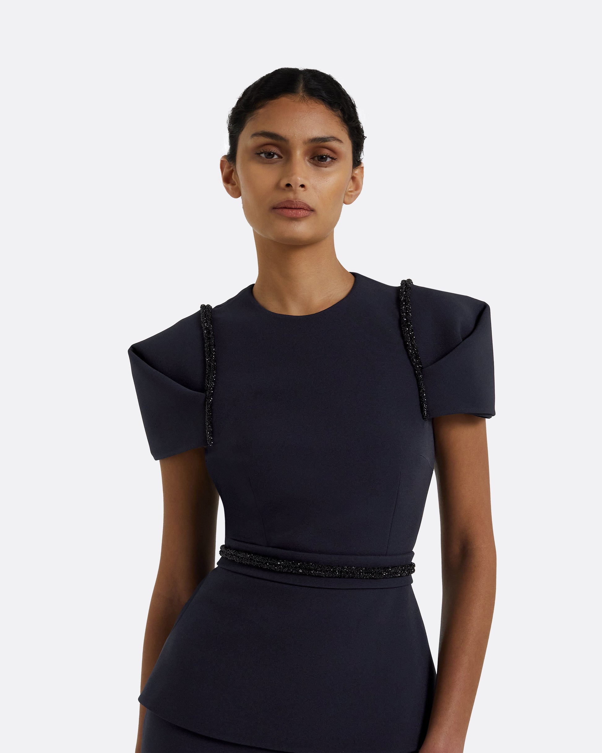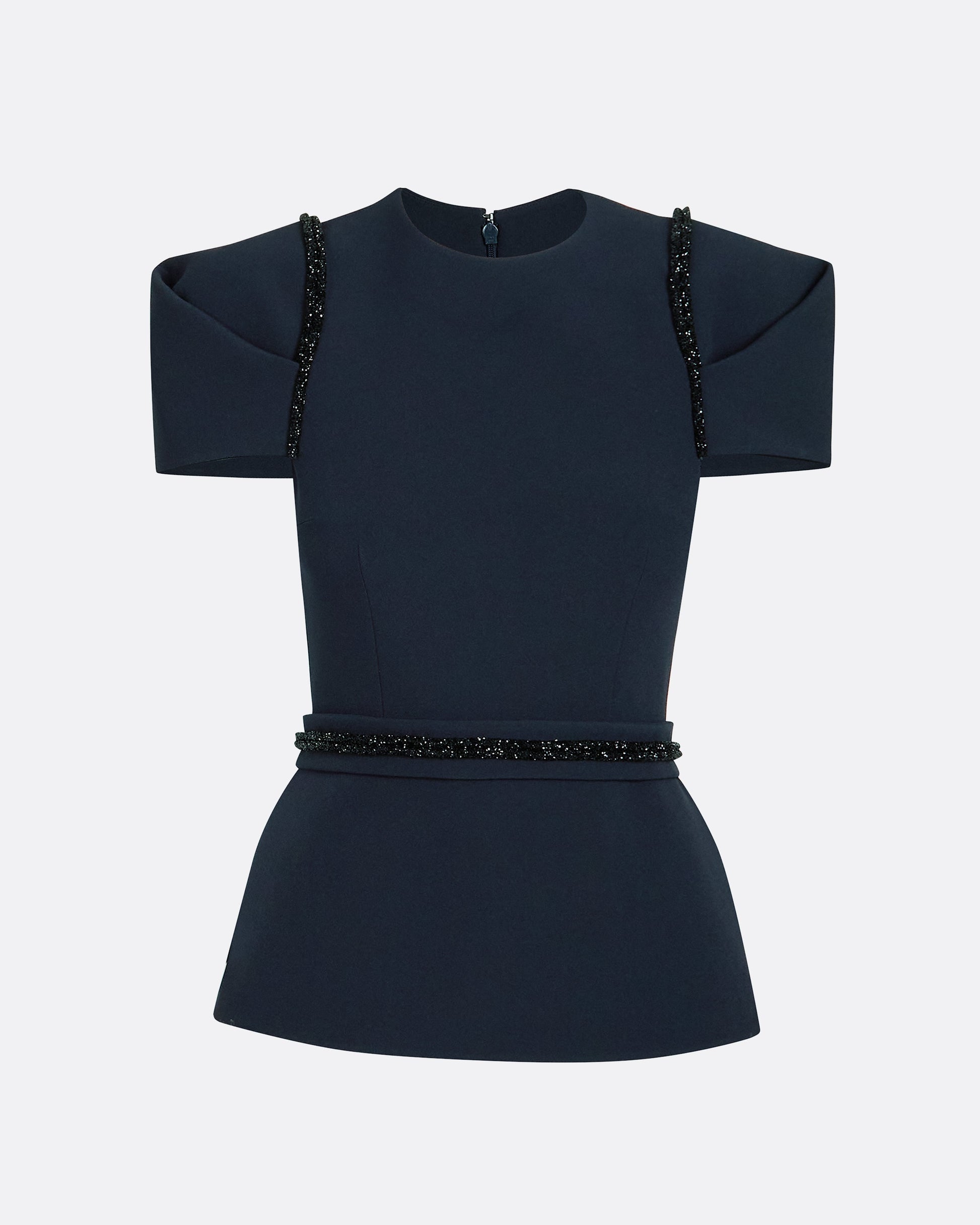 Crystal cord embroidered crew neck peplum top with draped short sleeve in midnight navy.