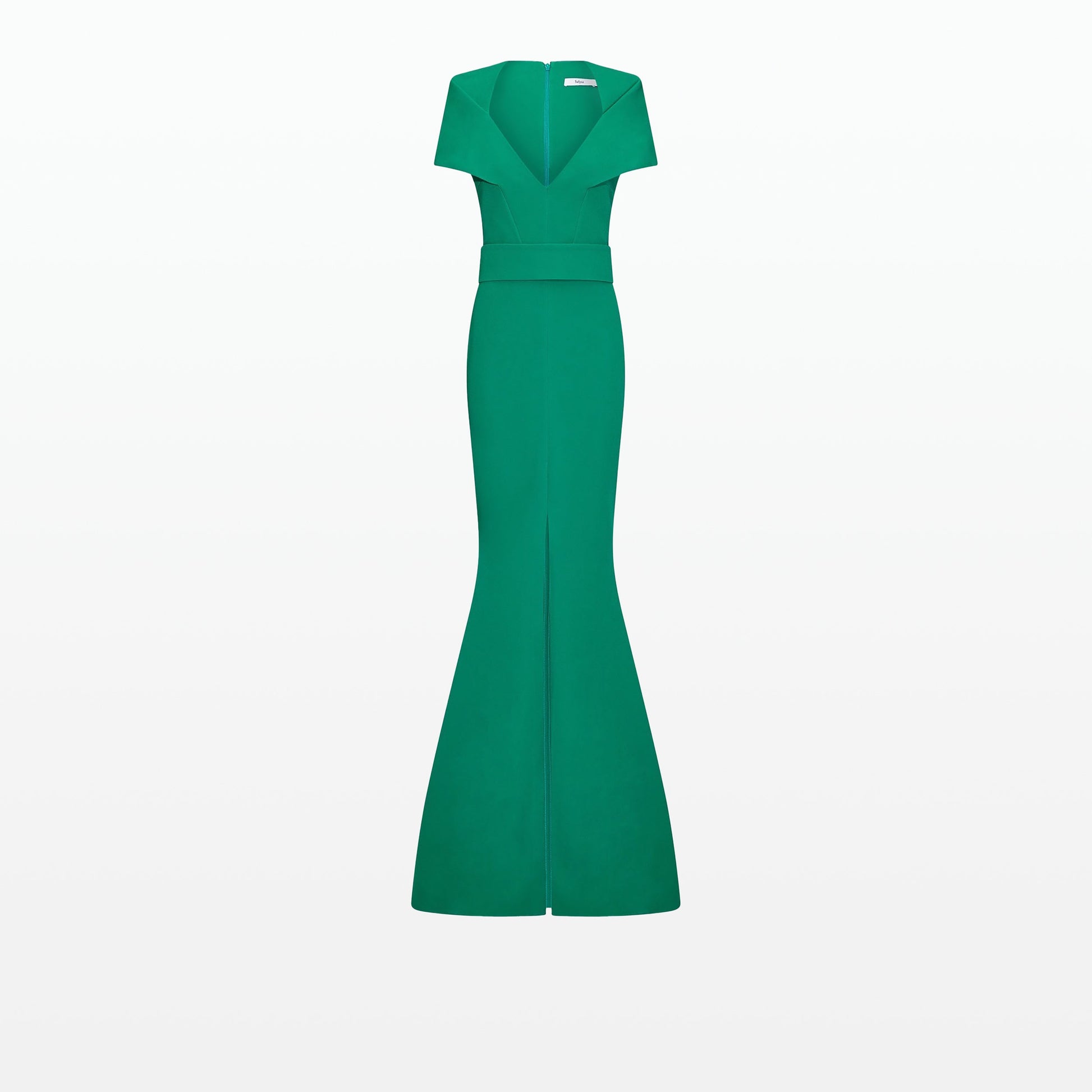 Draped, V-neck long dress with front slit in emerald.