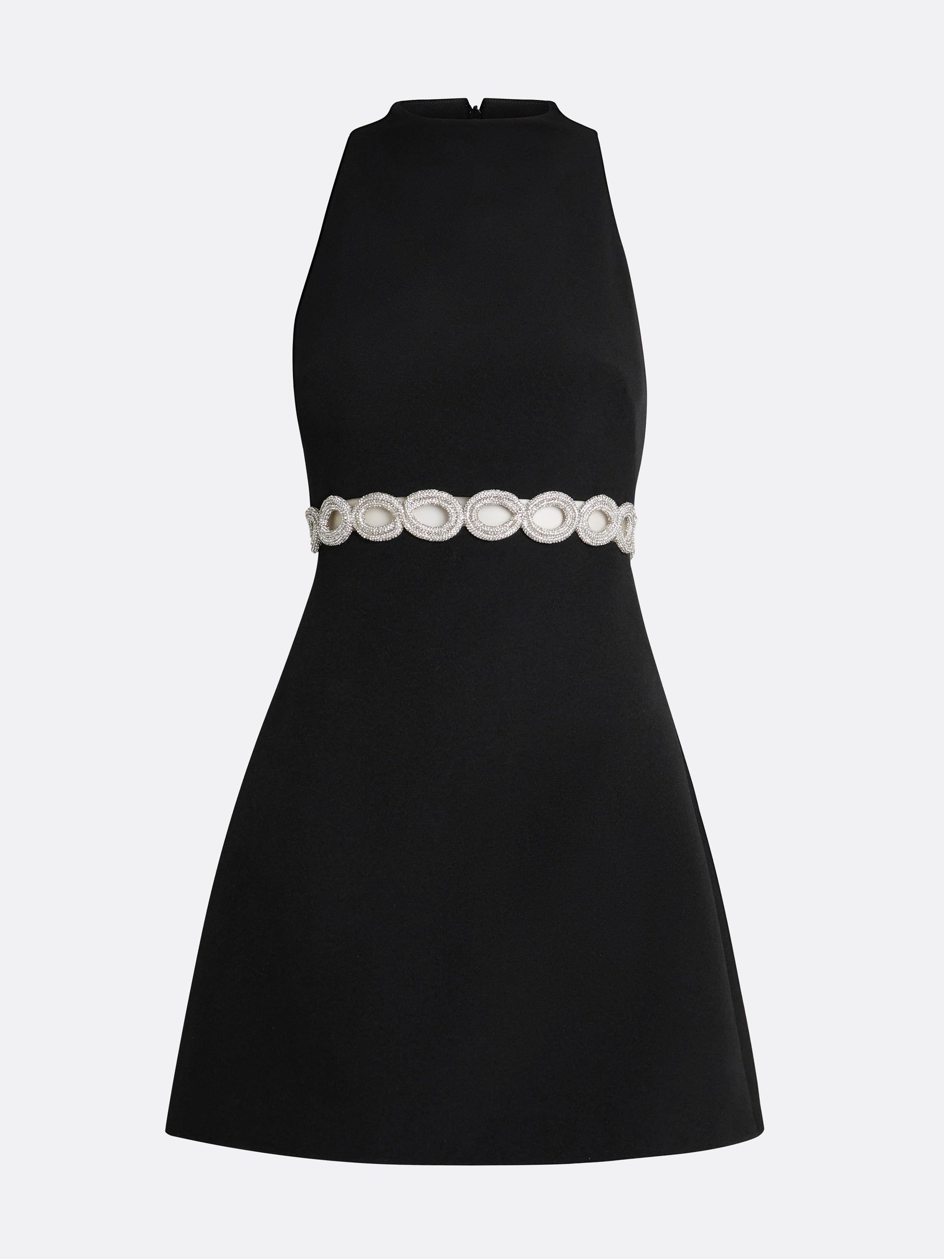 A-Line mini dress with soft, high neckline and racer back sleeve in black with crystal.