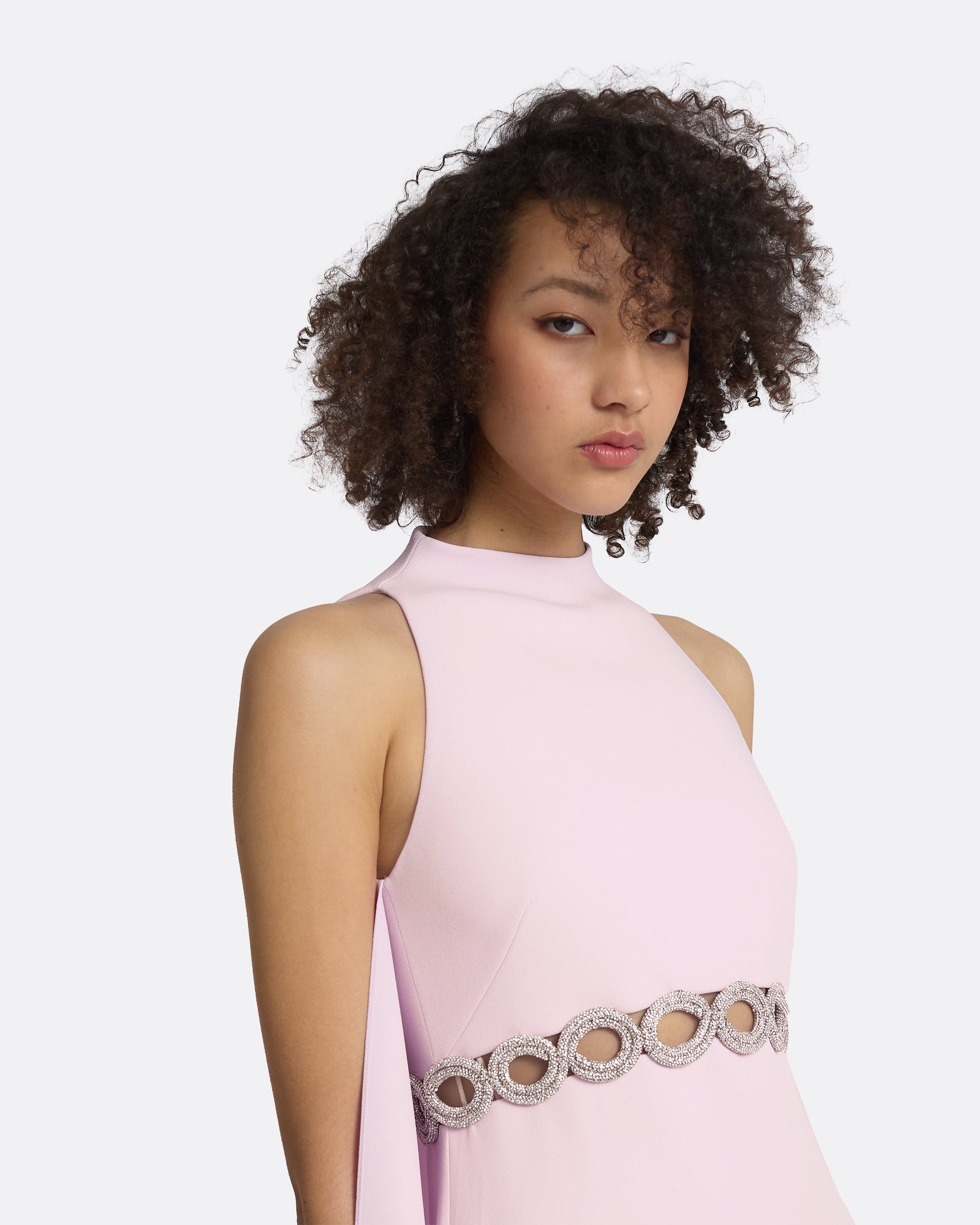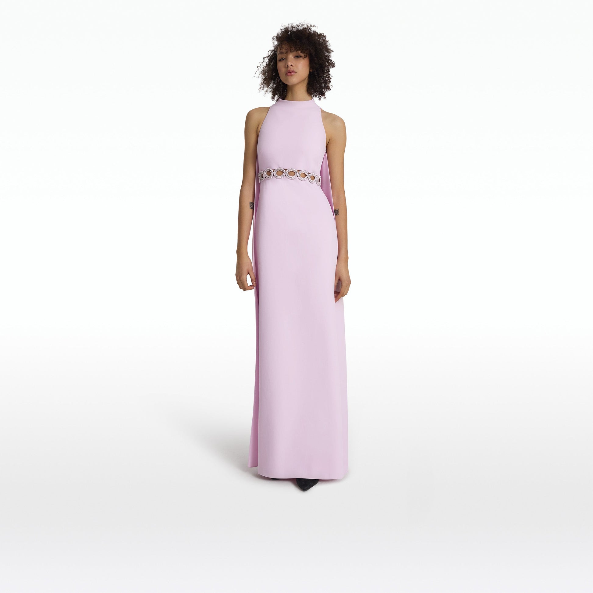 Floor length gown with soft, high neckline and split cape detailing in lilac snow Heavy Crepe with crystal Crystal Chain embroidery.