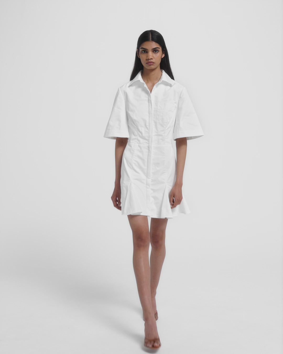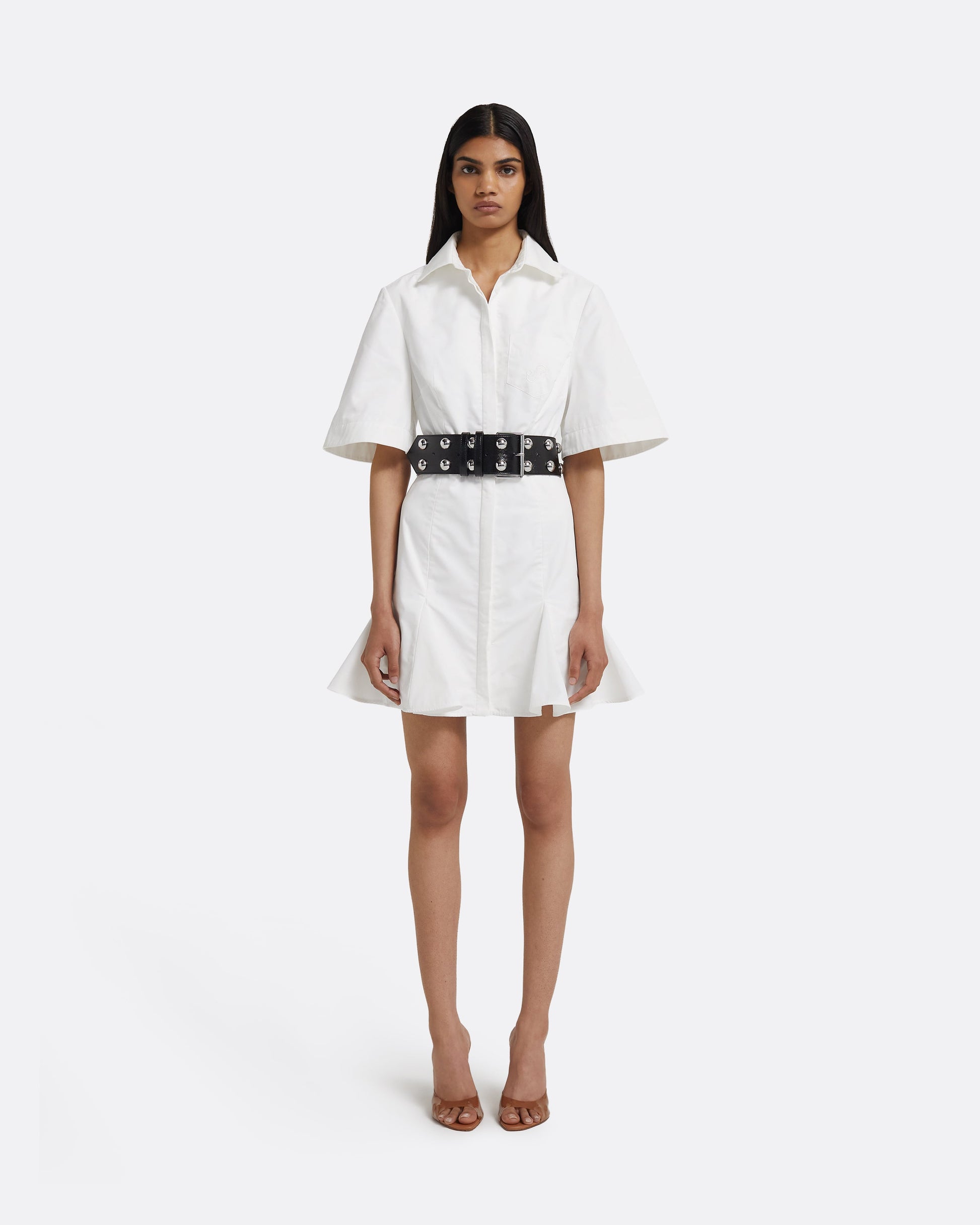 From the Resort ’26 collection, the Jude dress in ivory reimagines the shirt dress with a rebellious twist. Its crisp top line gives way to flared volume, opening the mini cut into a sculptural shape.
