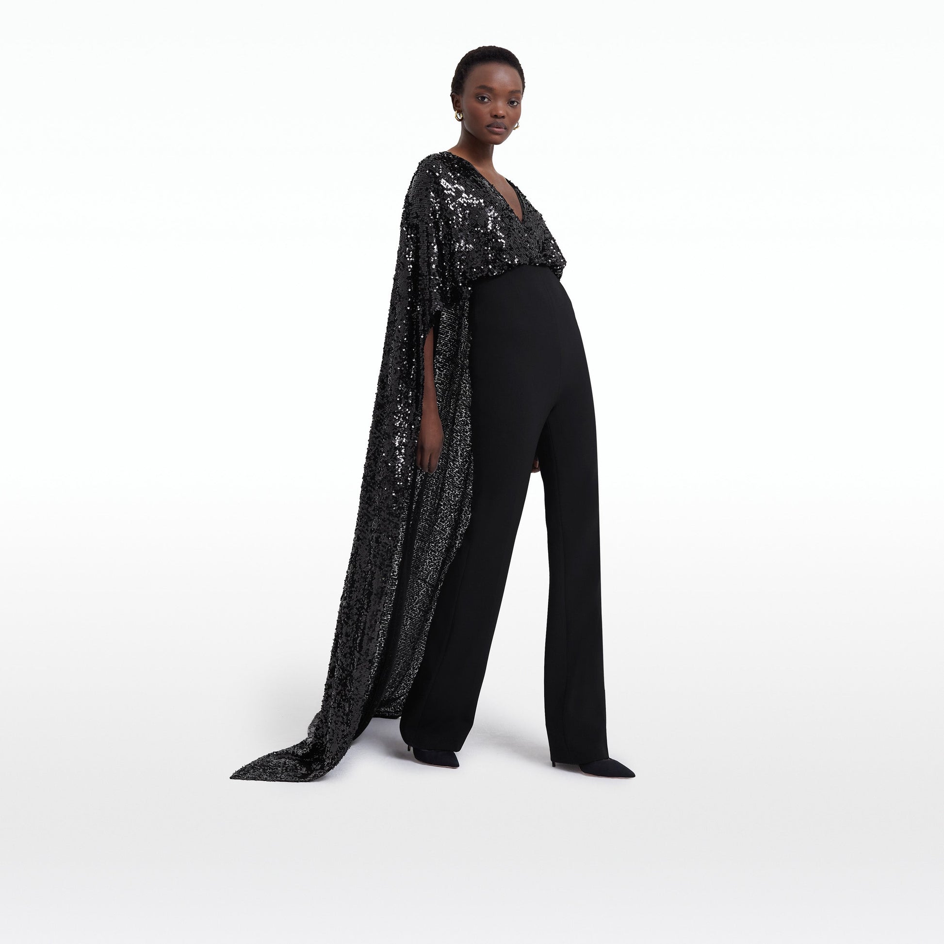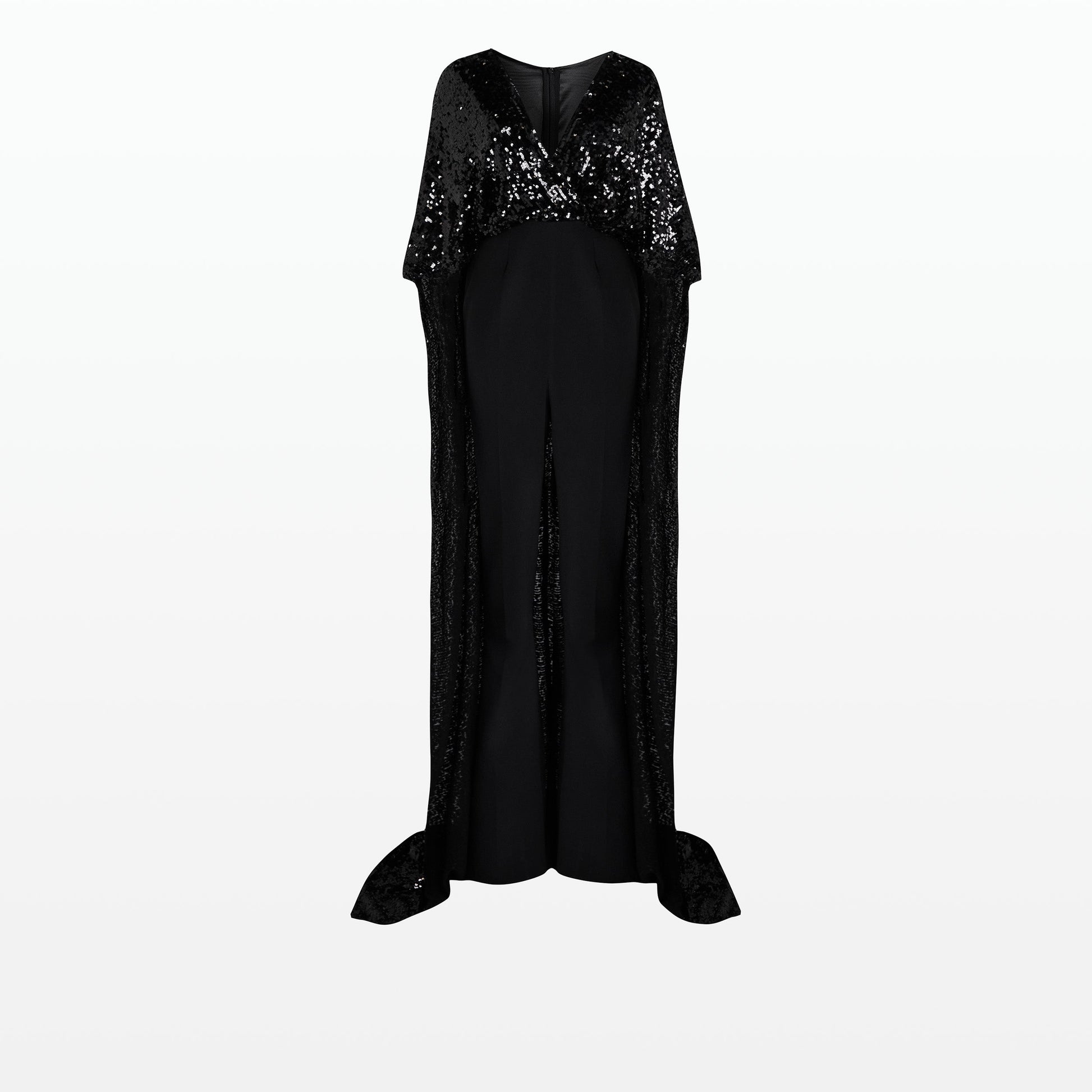 V-neck jumpsuit with full length cape detail in black Heavy Crepe and Fluid Sequins.