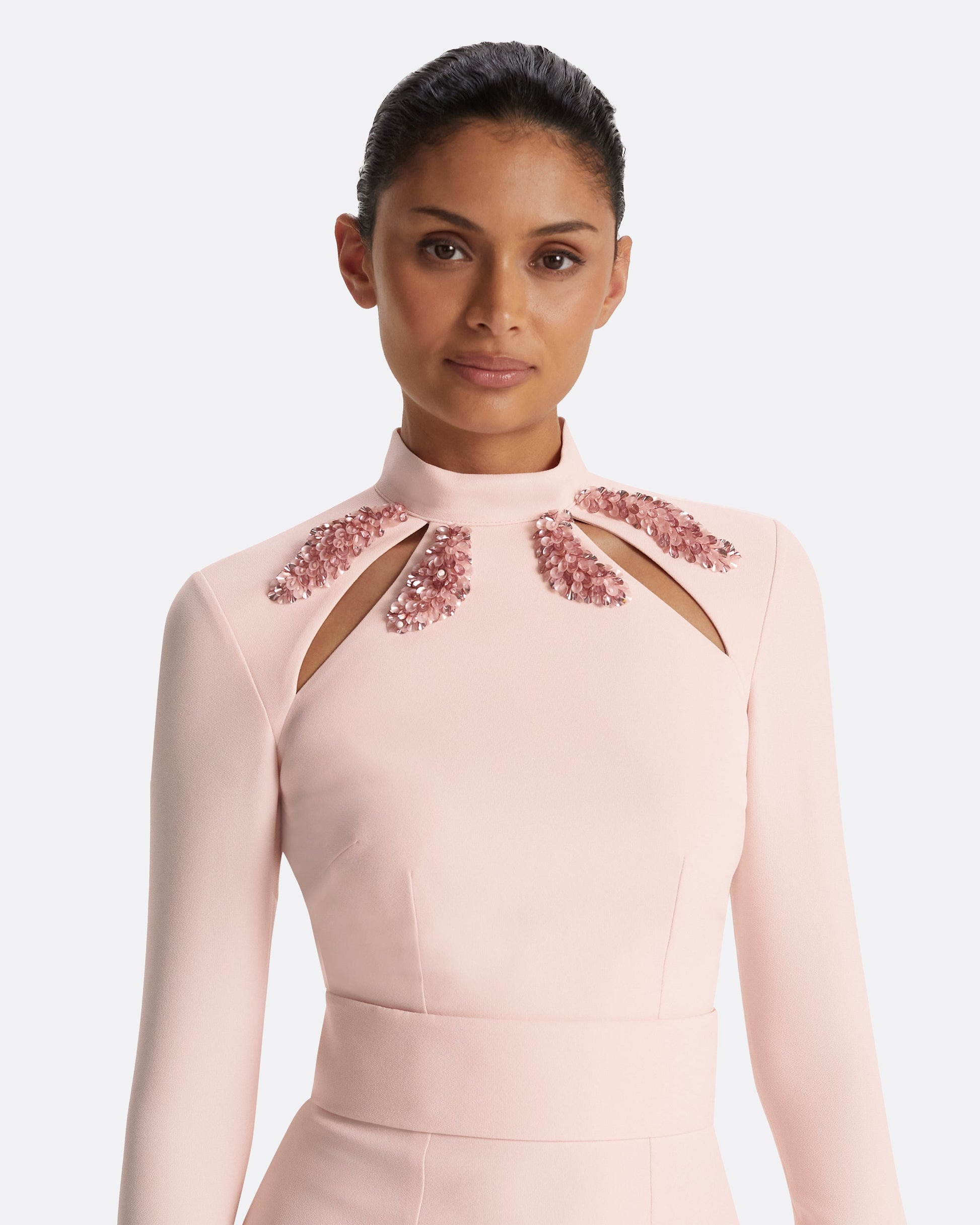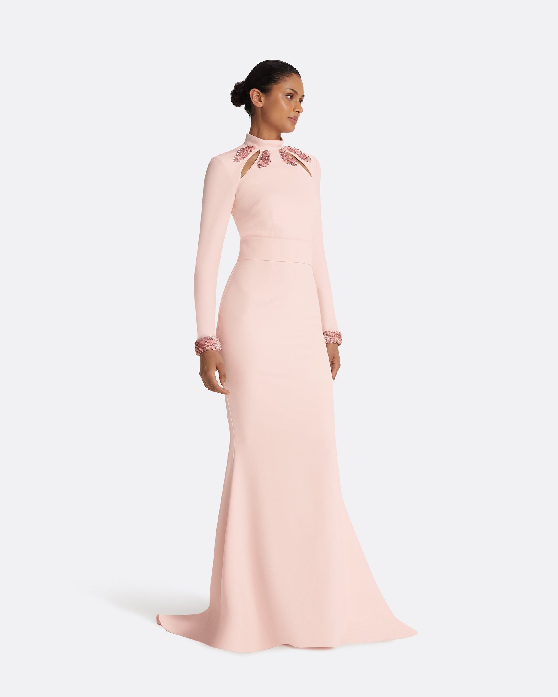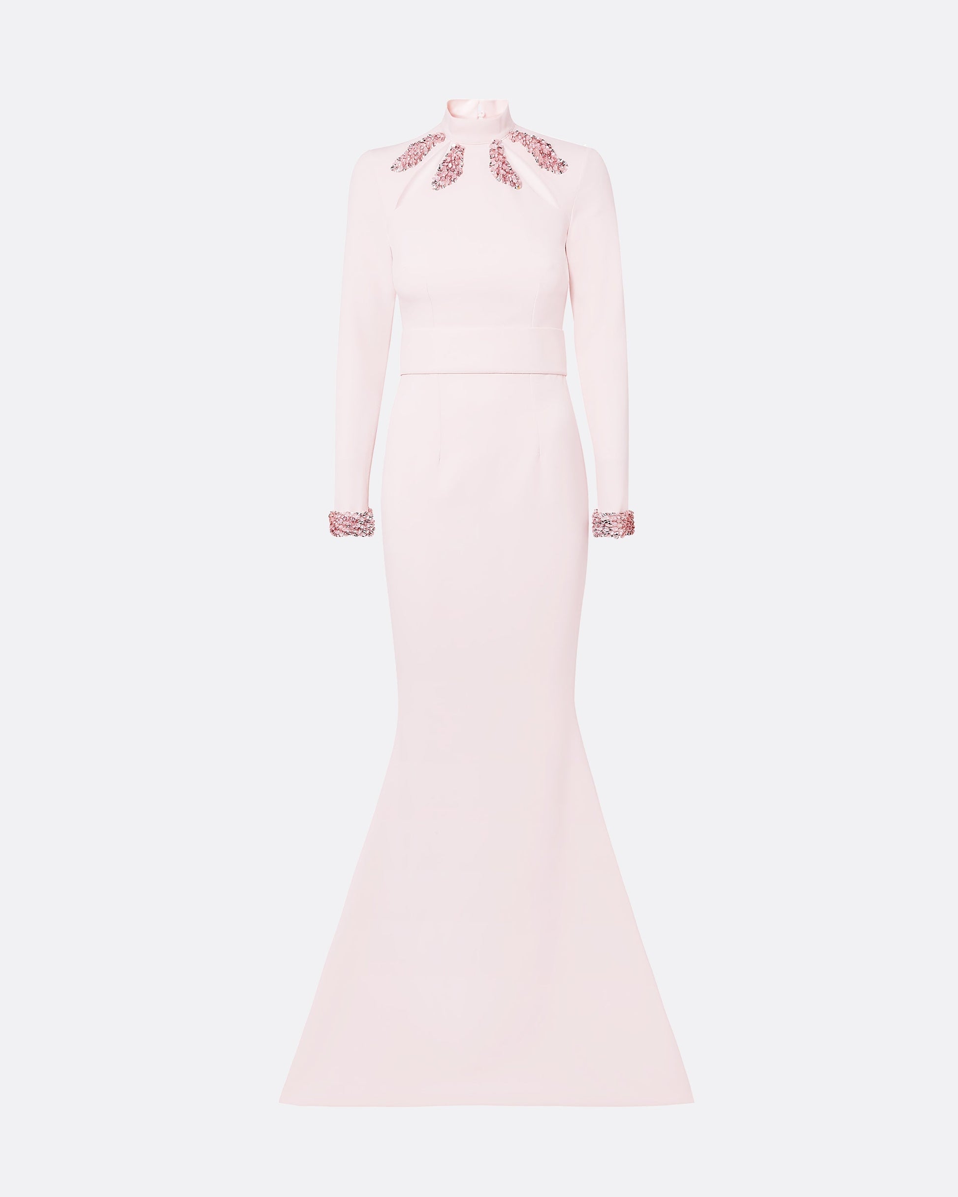 Pale Pink long sleeve long dress with mandarin collar in Heavy Crepe with barely pink Curled Leaf embroidery.