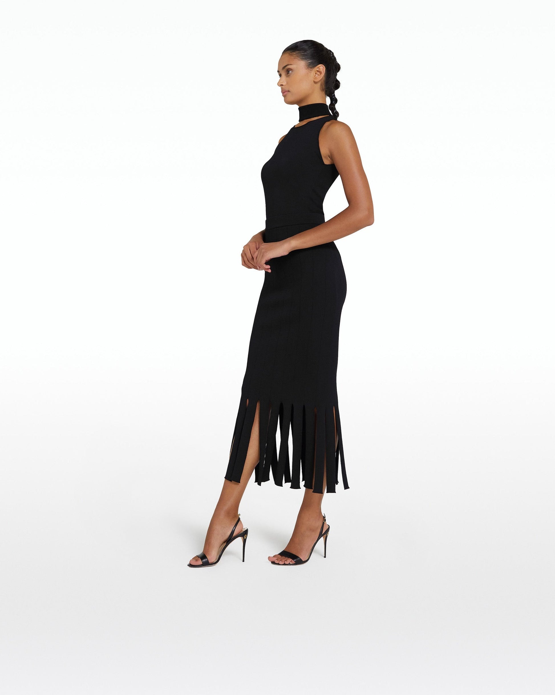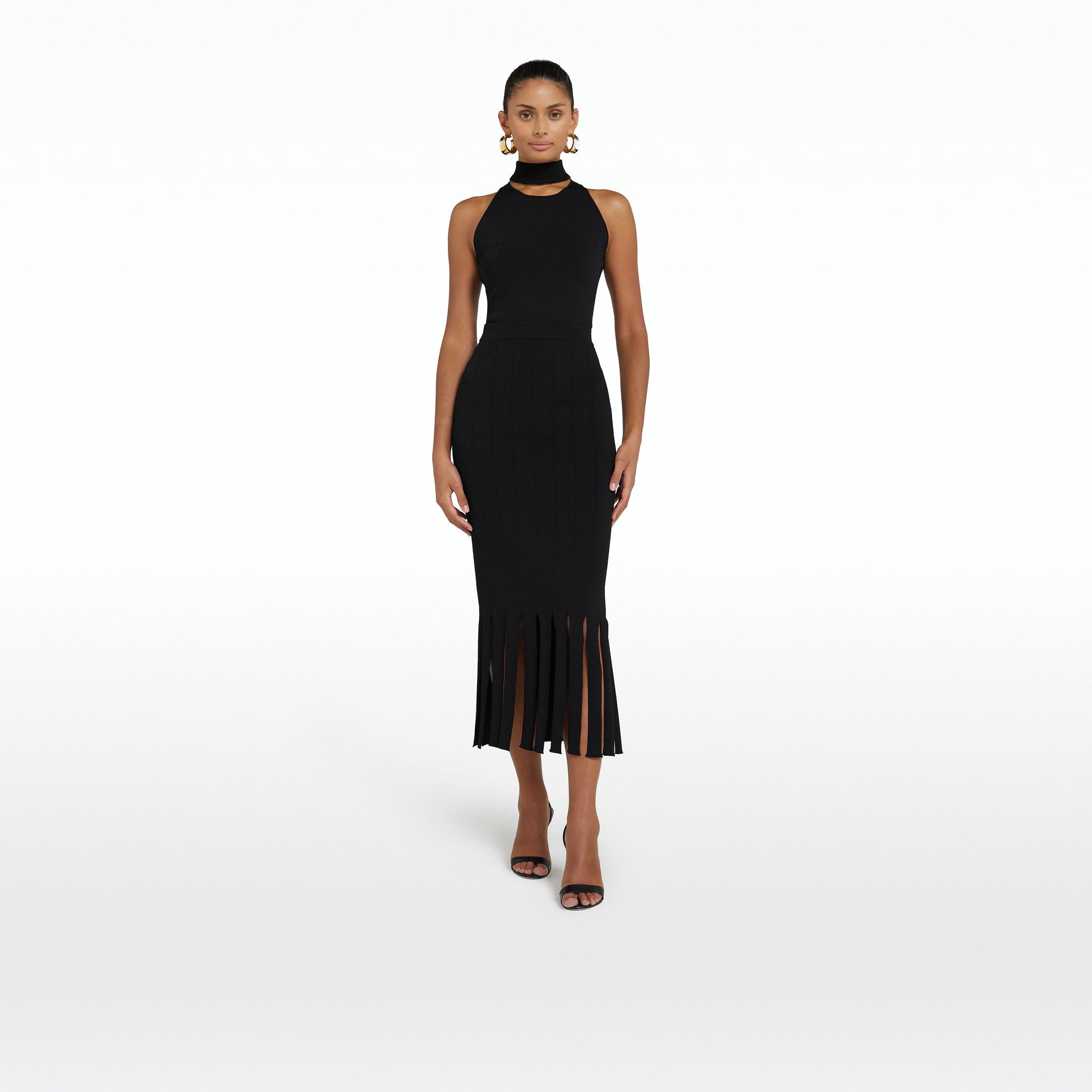 High waist, midi length skirt with fringe hem in black.