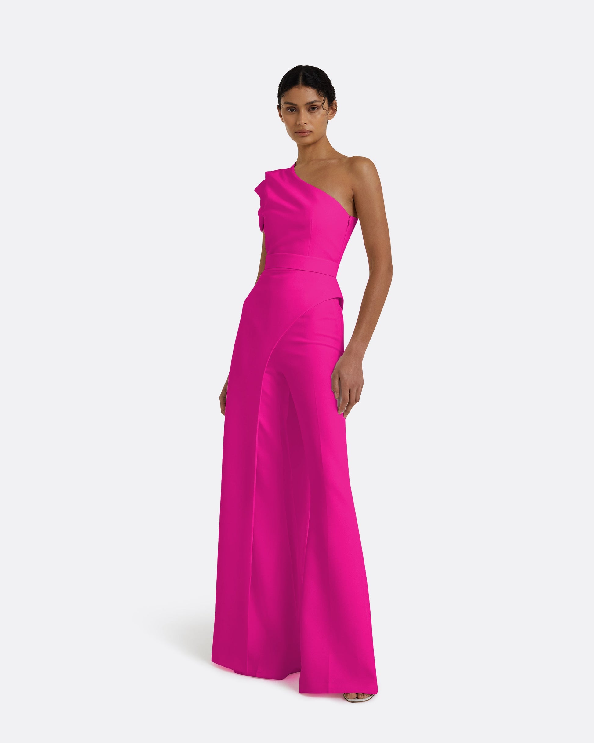 Asymmetric top with single pleated drape sleeve and one sided overlay in Wild Strawberry heavy crepe.