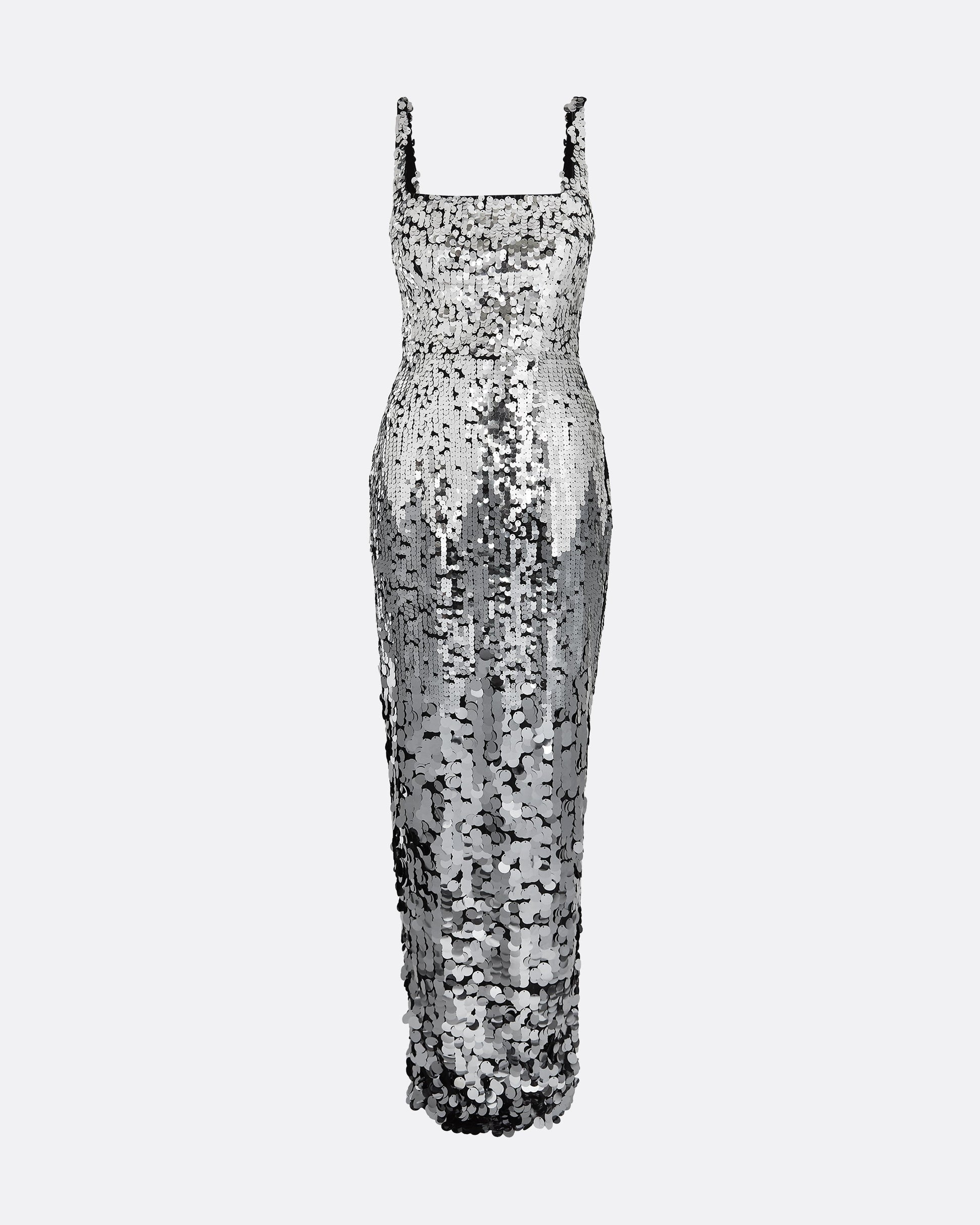 Square neck, column gown in gunmetal Aviation Sequin.