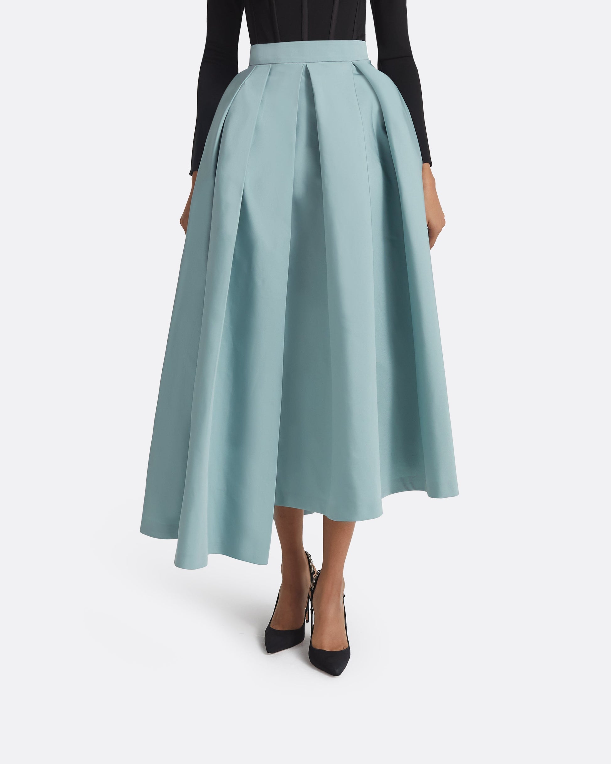 Full skirt with asymmetric hem and pleated detail in spearmint Faille.
