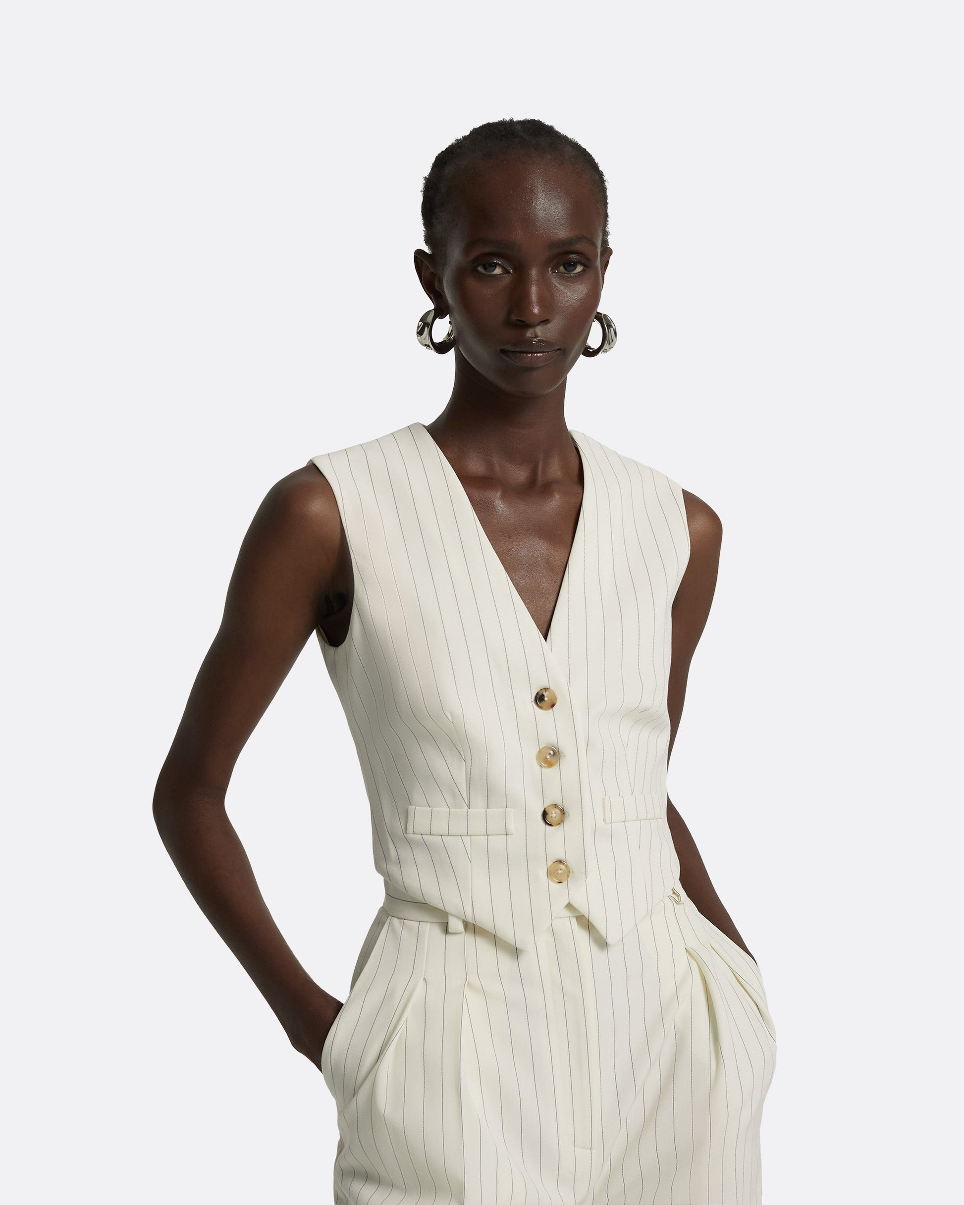Single breasted, cropped waistcoat in ivory pinstripe.