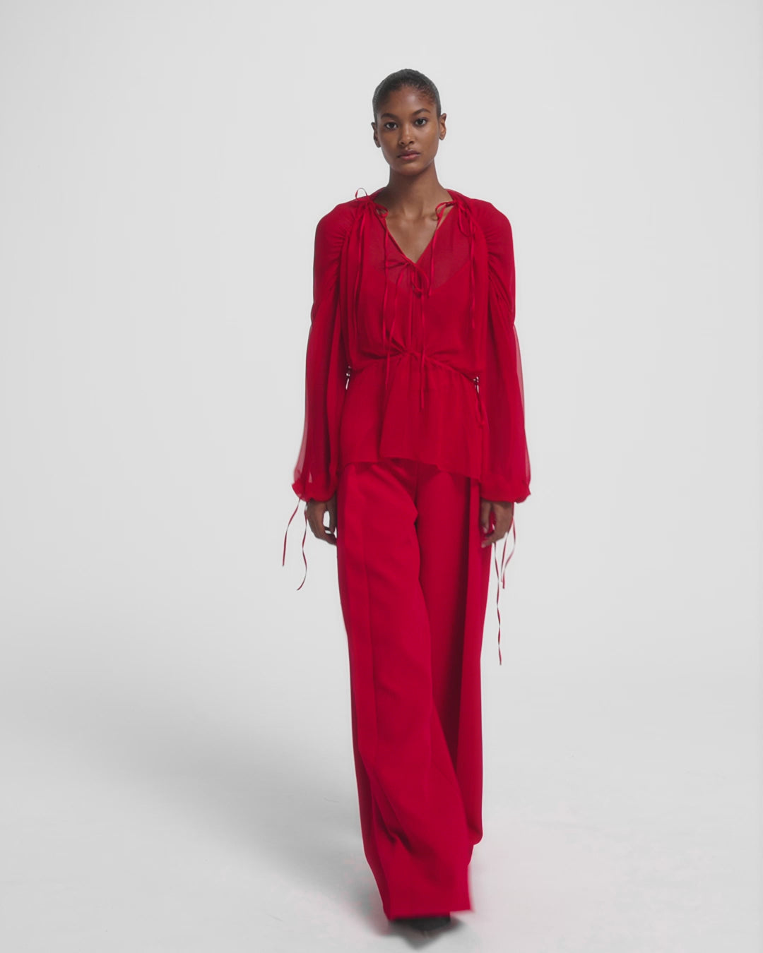 From the Resort ’26 collection, the Landon top in lacquer red balances softness and shape through gathered details and adjustable ties. Its sheer sleeves and flowing cut evoke lightness, grounded by the peplum waist and layered construction.