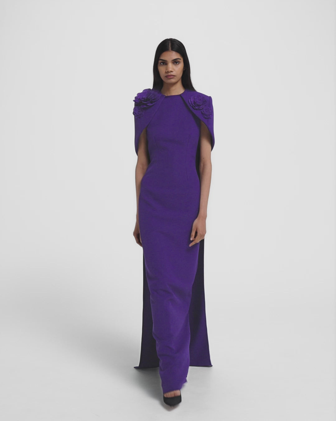 From the Resort ’26 collection, the Lennox gown in pansy channels a statuesque mood. Its column line is offset by sweeping cape elements, creating a balance of restraint and drama.