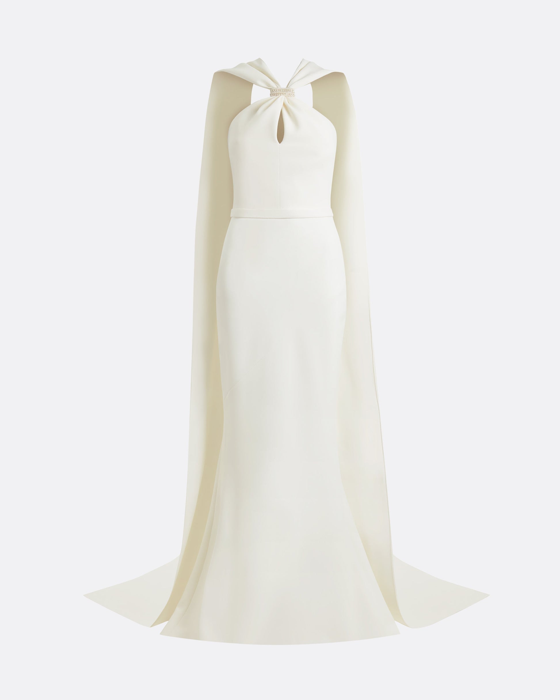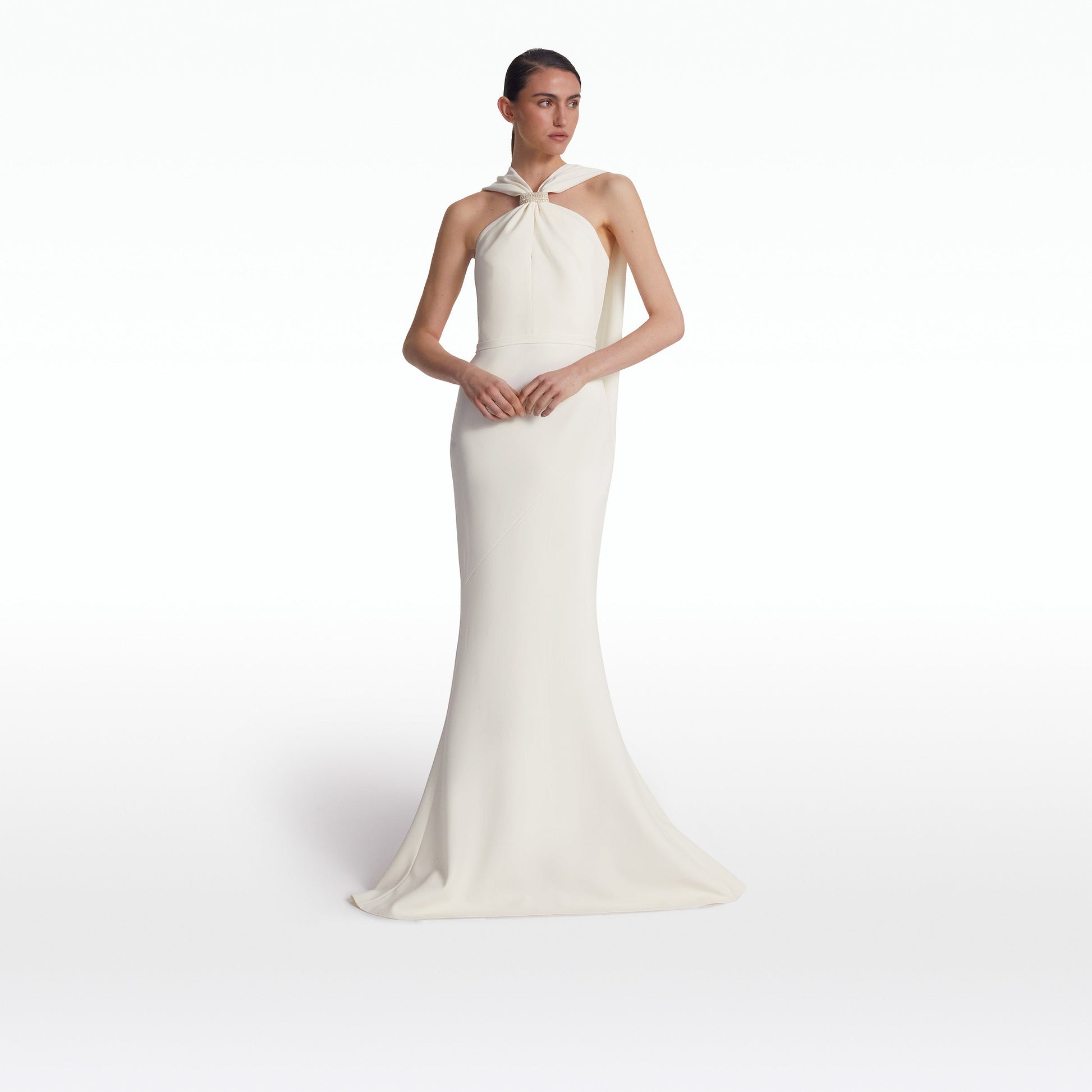 Elegant floor length, halterneck gown with soft fishtail skirt and back train in ivory Heavy Crepe with pearl Carnation Trim embroidery.