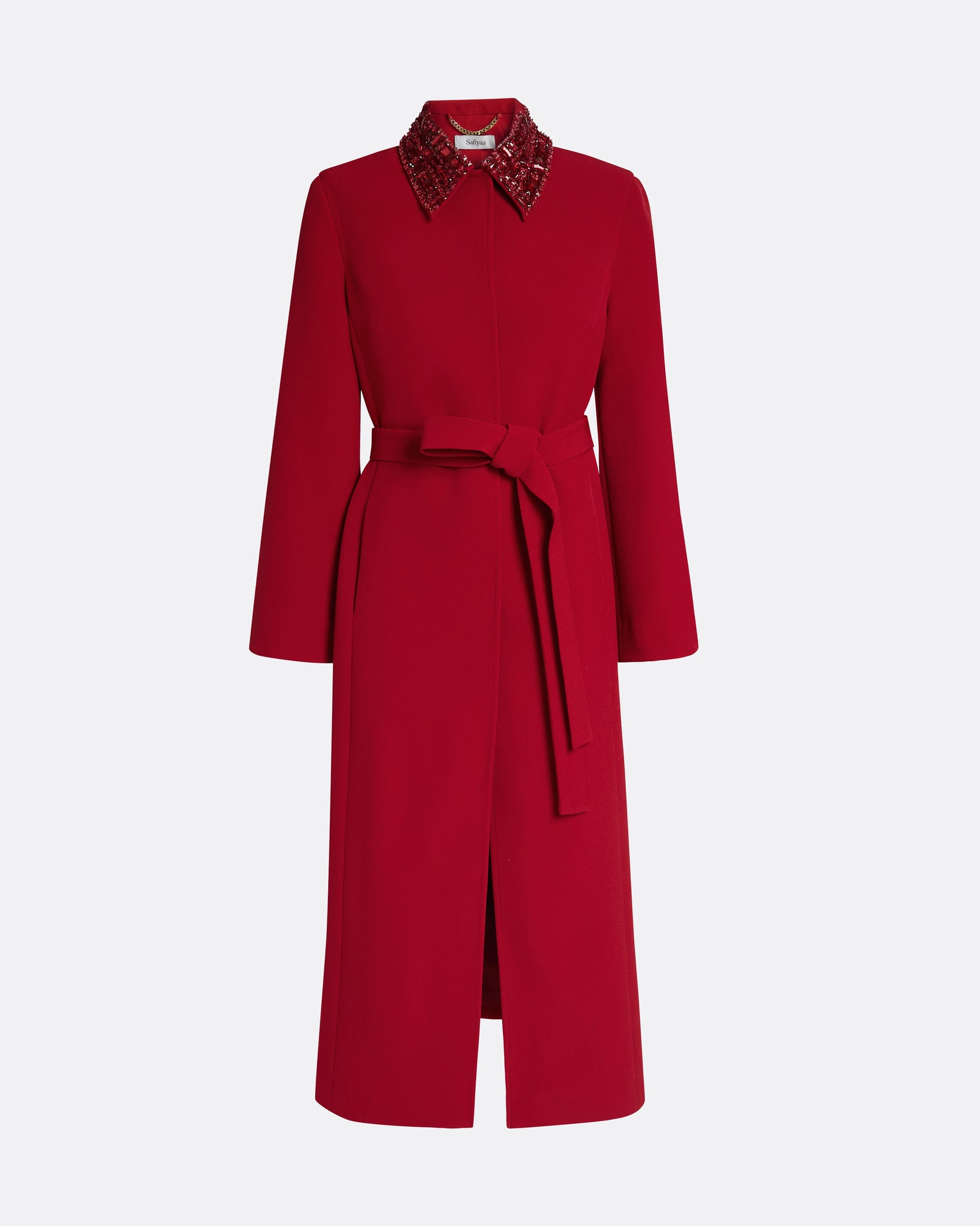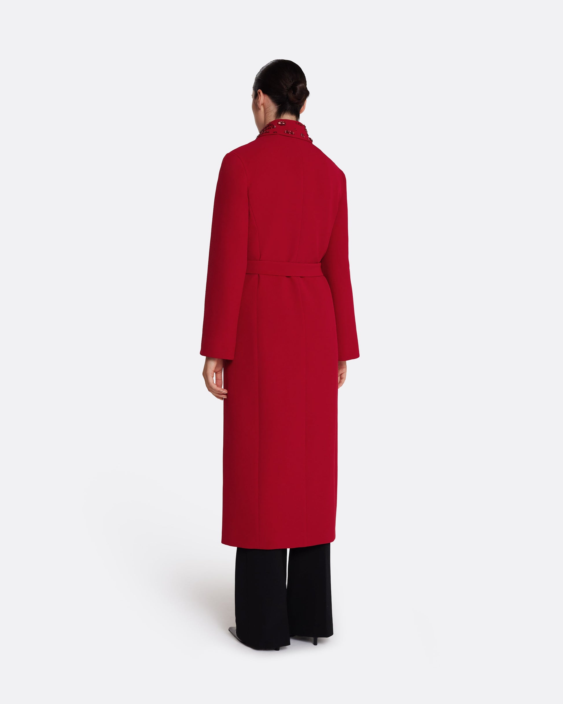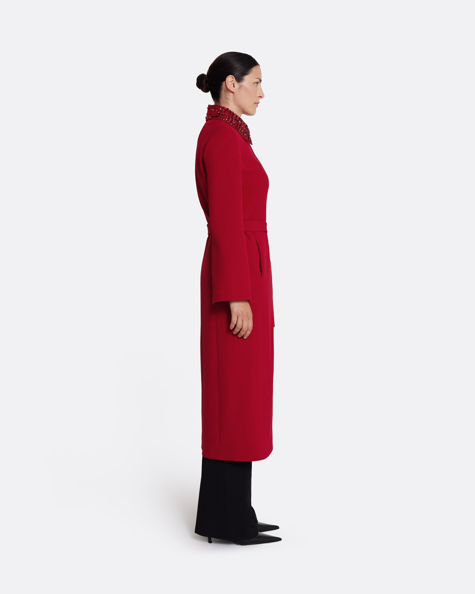 From the Spring Summer ’26 collection, the Lillita Coat in azalea red brings structure and precision to outerwear. Defined by its clean lines and tonal belt, the look is elevated by a contrast collar in multicolored red embellishment—an ornamental detail that draws the eye.