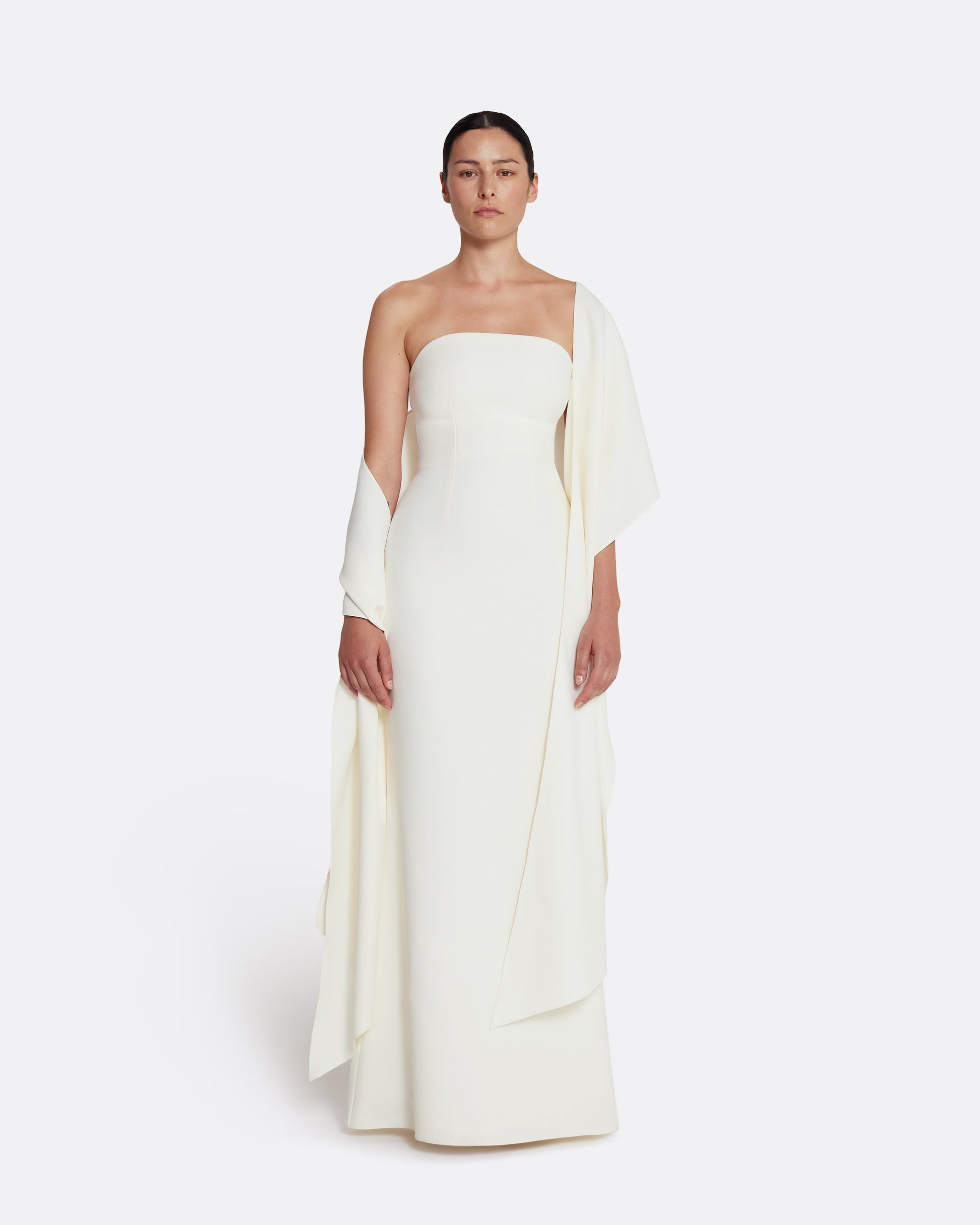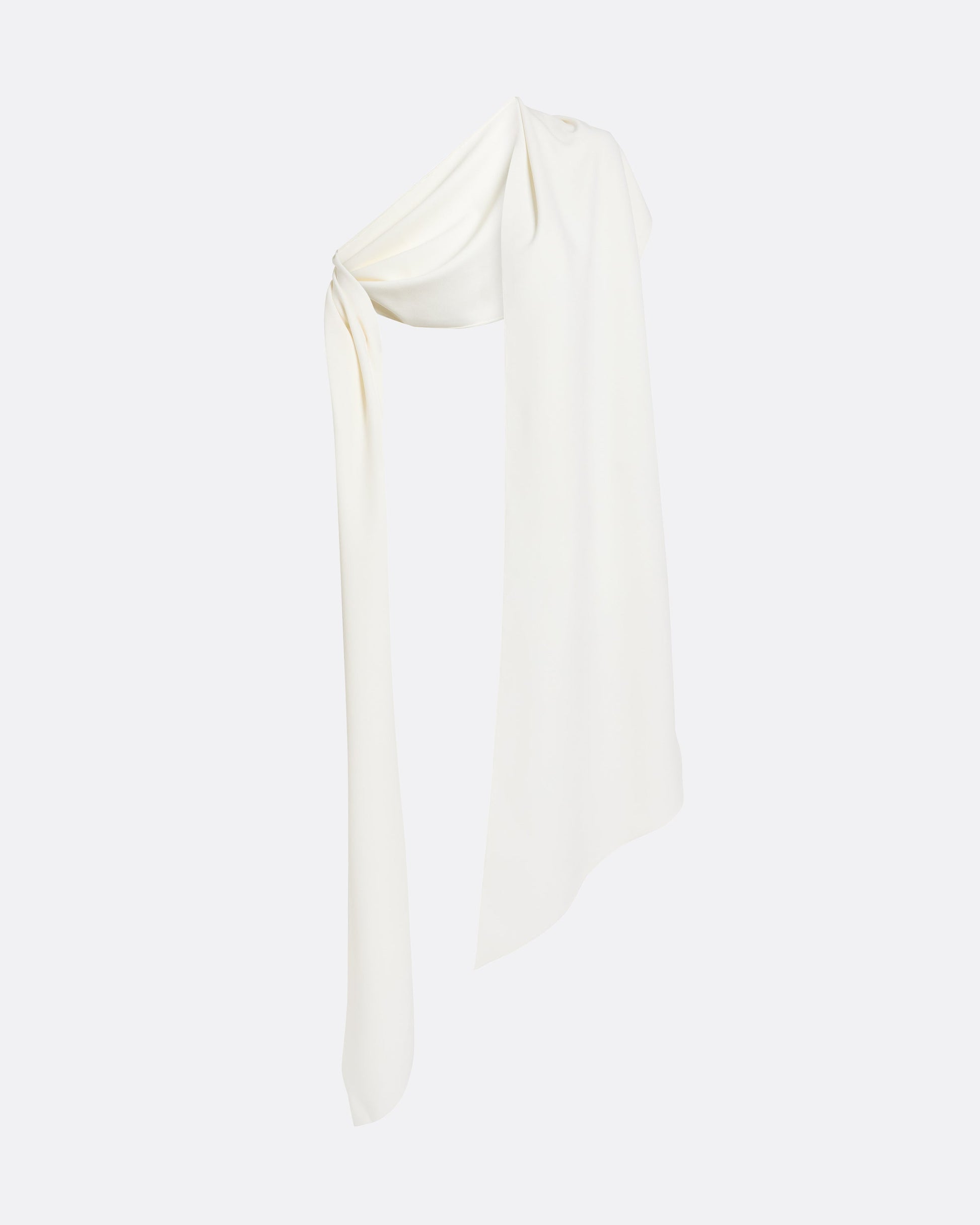 From the Spring Summer ’26 collection, the Long Shawl Scarf in ivory brings purity of line to evening dressing. Its elongated shape and crisp drape create an architectural frame, lending poise and movement to clean silhouettes.