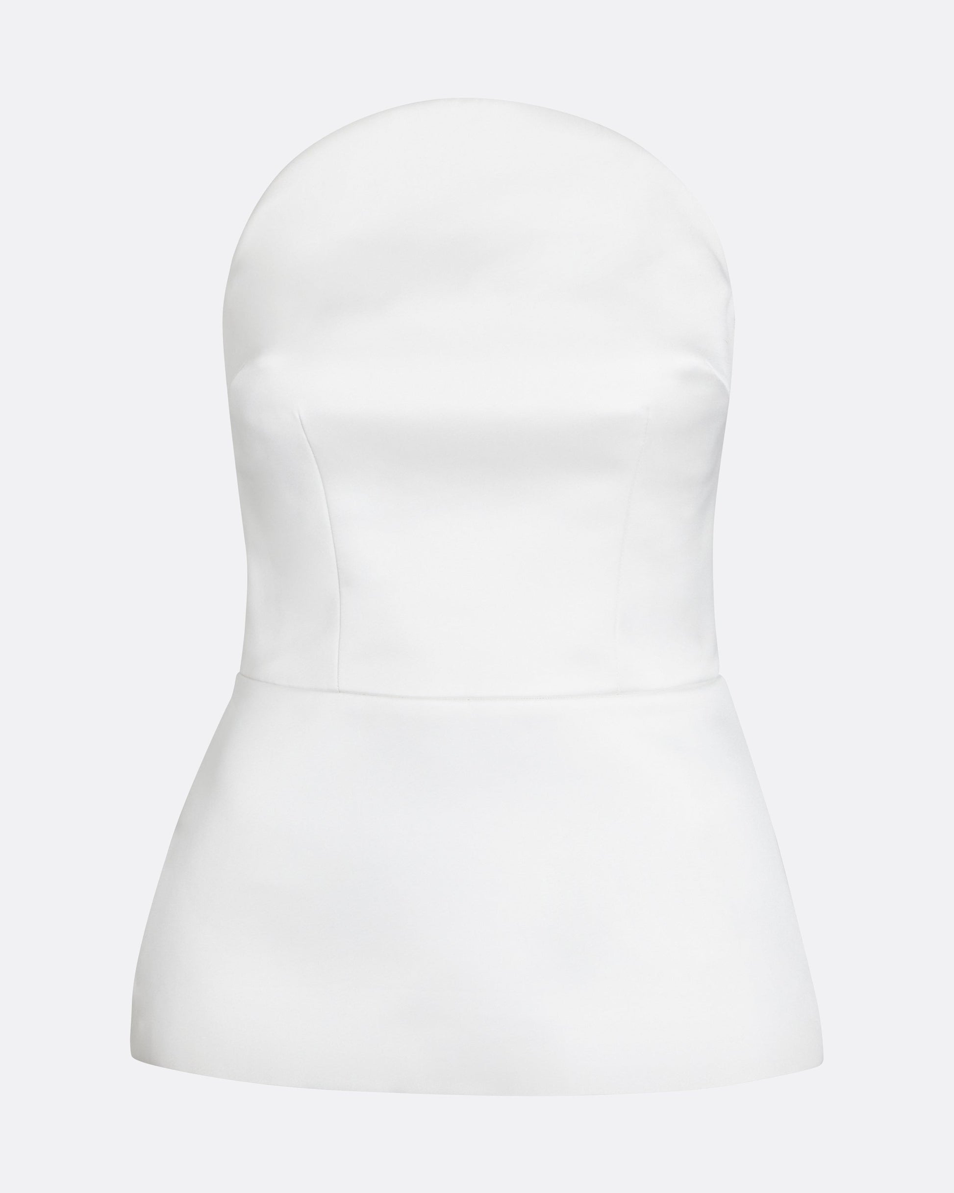 From the Bridal ’26 collection, the Lorena top in porcelain is defined by its sculpted lines and refined construction. A curved neckline and structured base are balanced by the soft flare of the peplum, creating a piece that feels both strong and feminine.