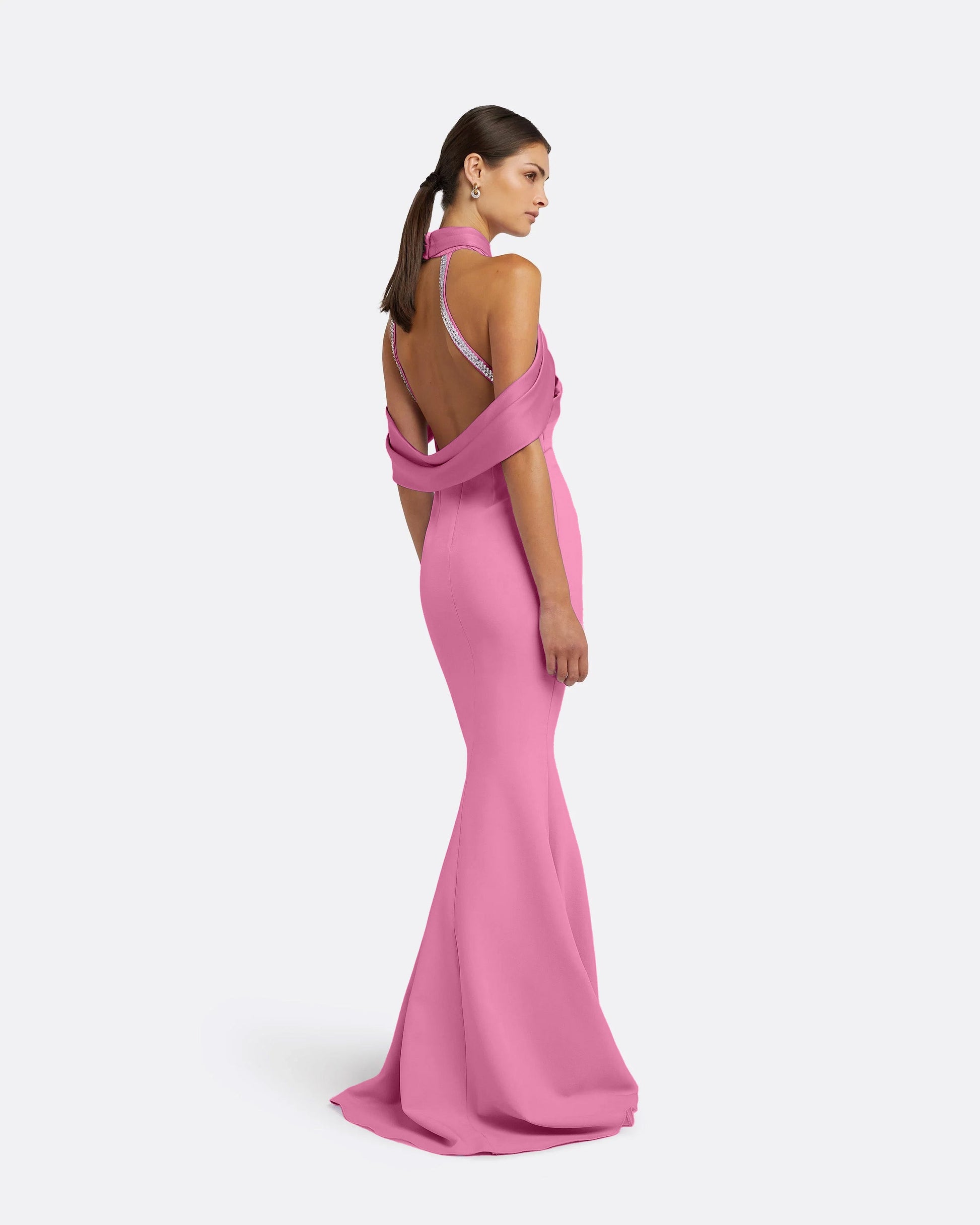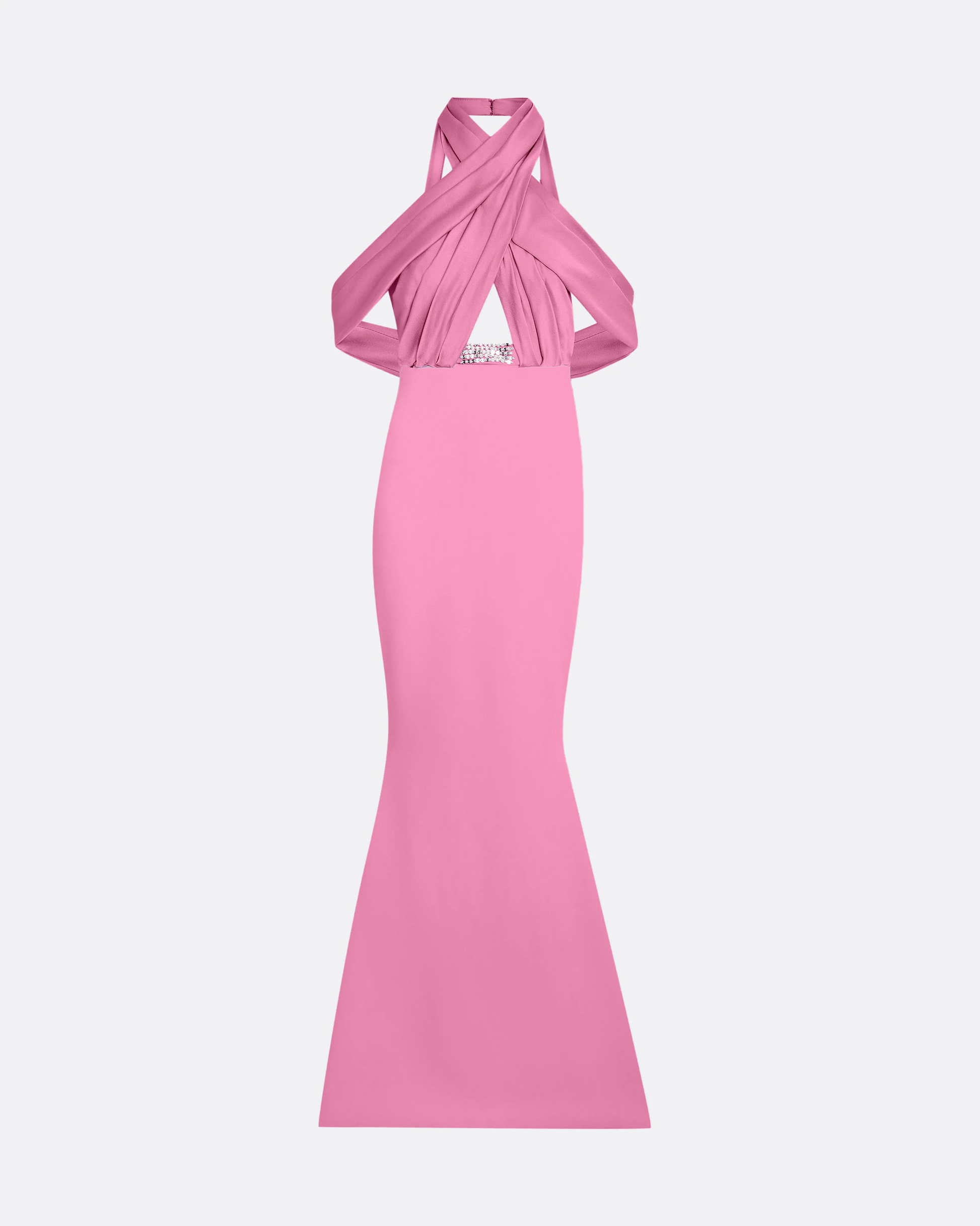 Column gown with flattering cross over bustier, cut out detail and open back in aurora Heavy Crepe and Satin Back Crepe, with crystal Mirror Disc embroidery.