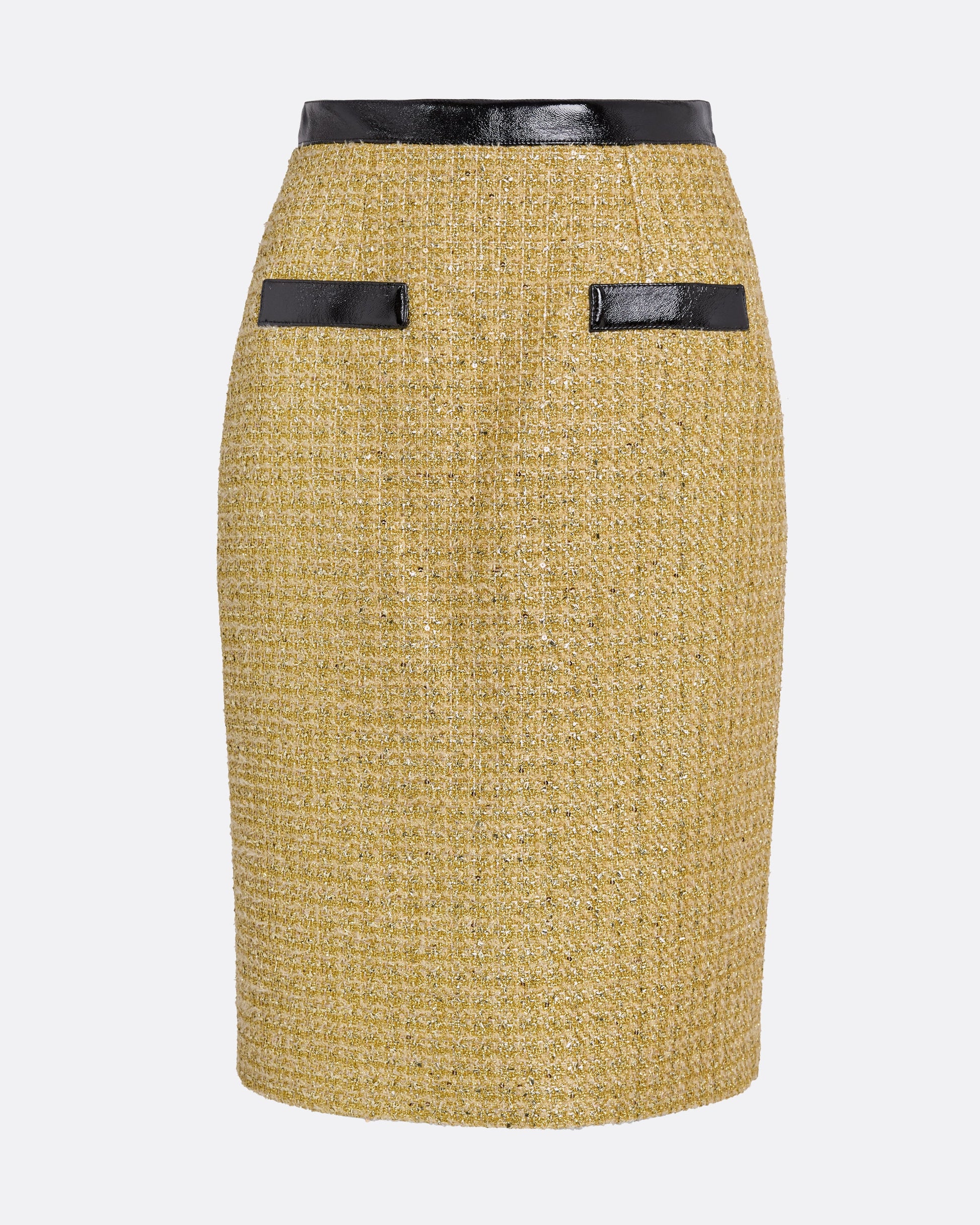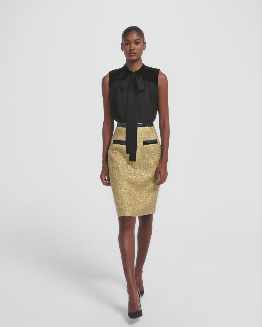 From the Resort ’26 collection, the Lucas skirt in black on yellow gold blends polish with personality. Its structured pencil shape is underscored by sharp contrast detailing, offering a graphic touch to the tailored finish.