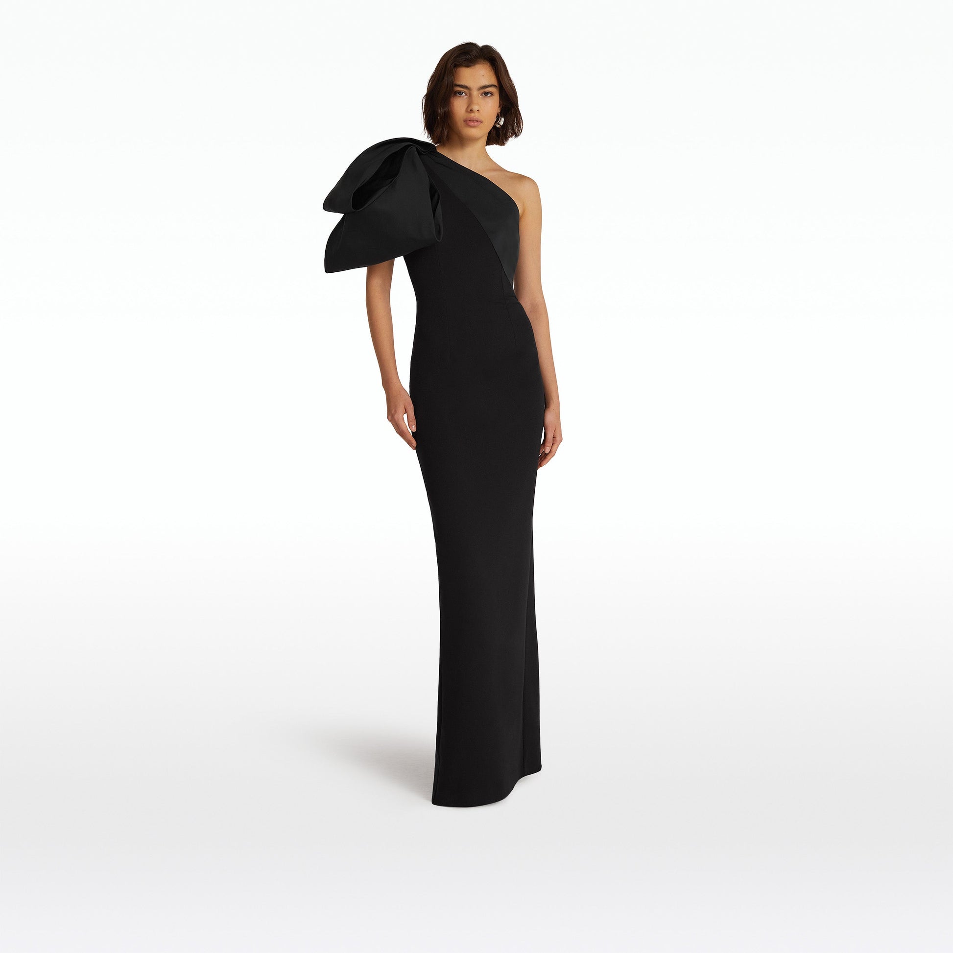 Asymmetric shouldered gown with statement bow drape detail in black Heavy Crepe and Faille.