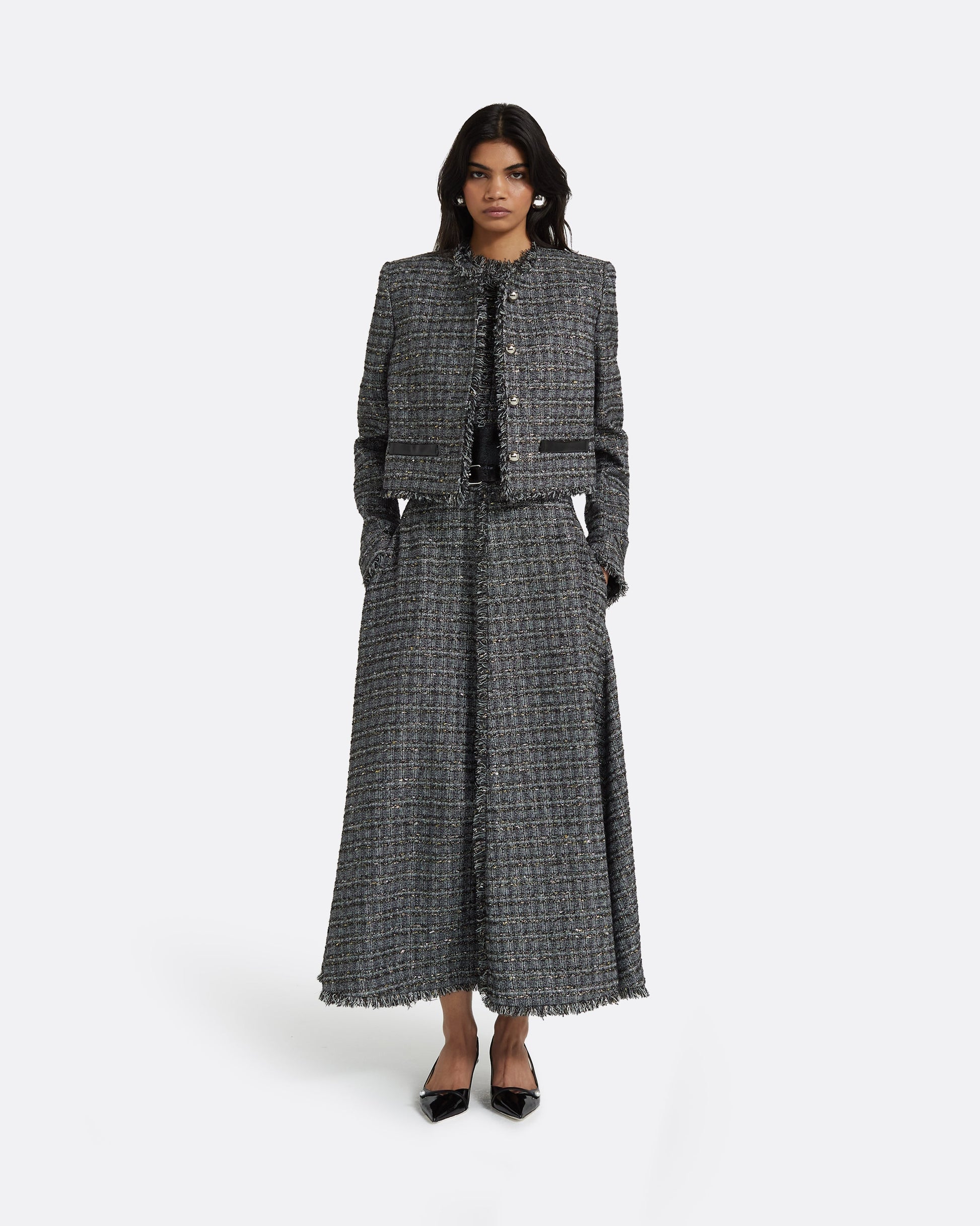 Styled with the Amelia jacket in metallic greyscale. Fits true to size. Model is 175cm | 5'9'' and wearing a FR36 Metallic Ribbon Tweed: 42% Viscose, 27% Wool, 17% Polyamide, 8% Acrylic, 4% Cotton, 2% Polyester.