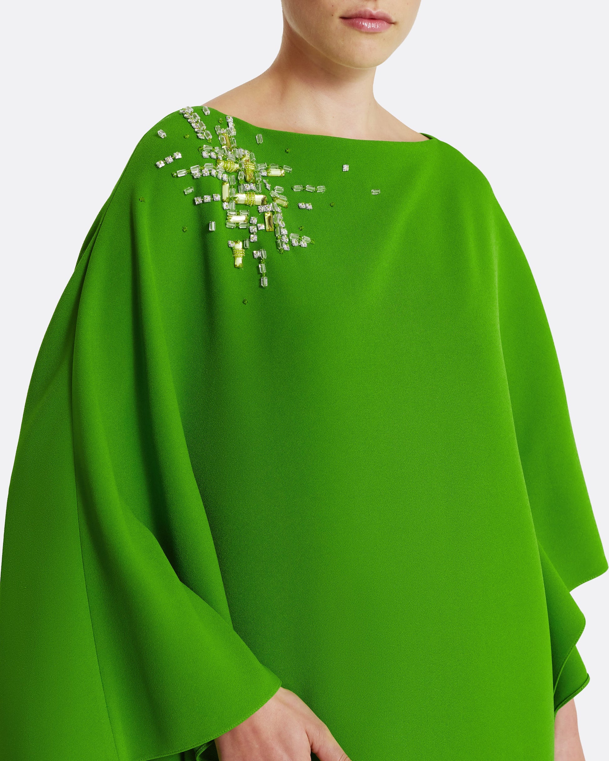 From the Spring Summer ’26 collection, the Marcellina dress in verdant green is refined in its simplicity. Cut in a straight, elongated line with three-quarter sleeves, the design is offset by a constellation of hand-applied embellishment across the left shoulder in tonal green hues.