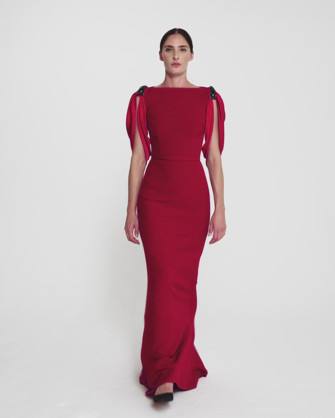 • Strap sleeve with shoulder ties and crystal shoulder detail