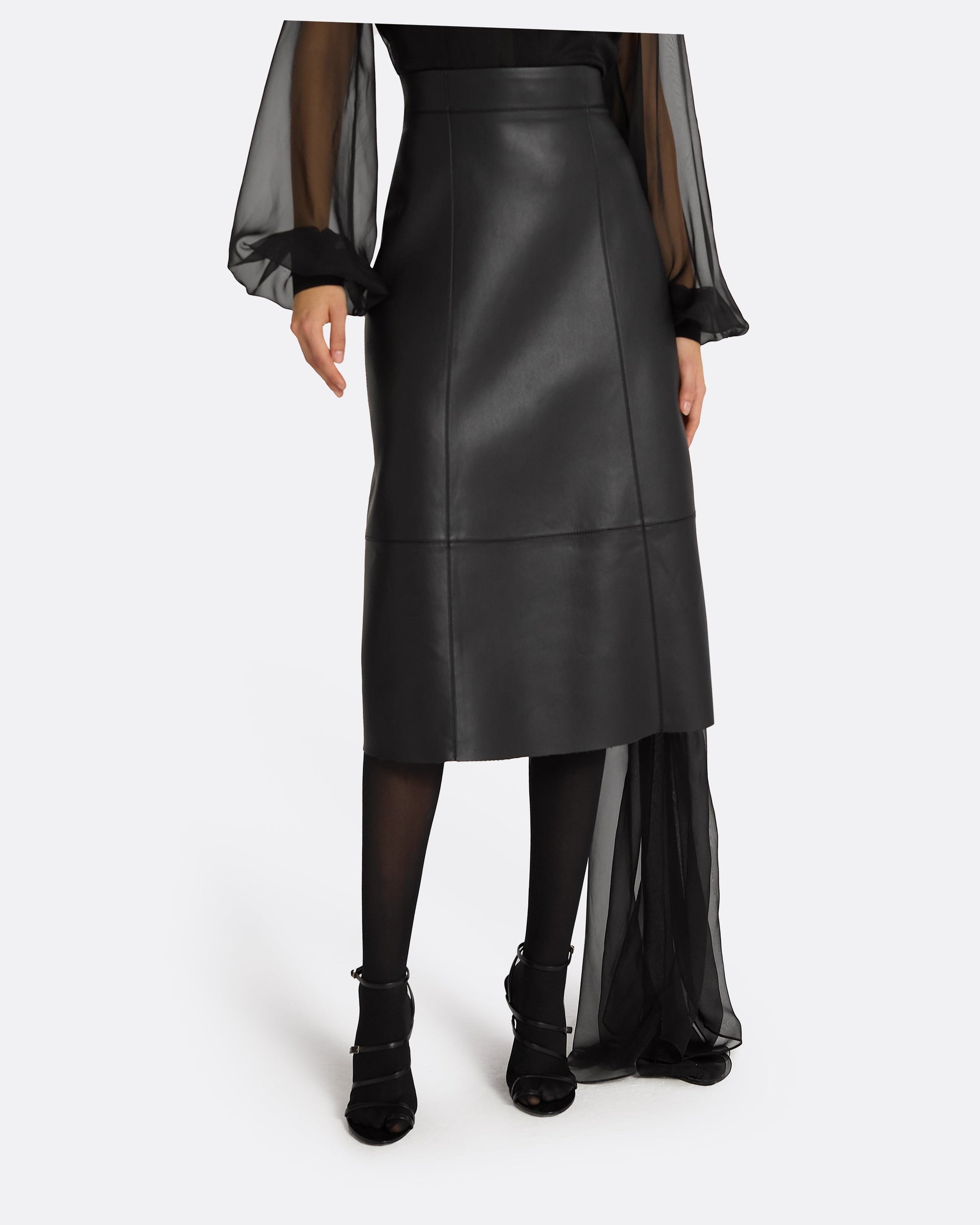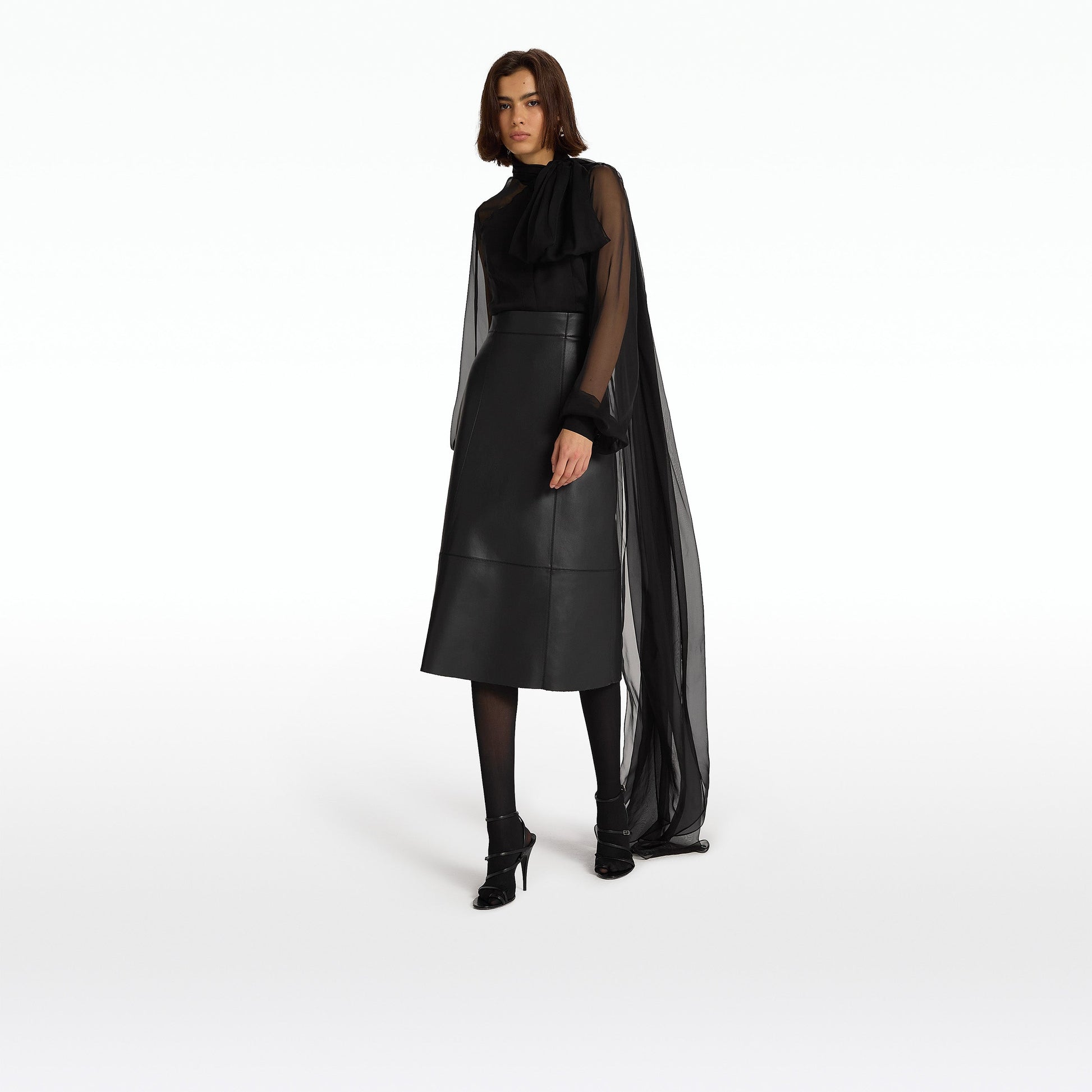 High waist, mid-calf skirt with panels and top stitch details in black Cactus Vegan Leather.