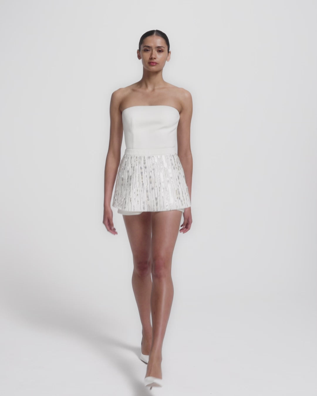 From the Bridal ’26 collection, the Matilda skirt in ivory reworks a classic skort with a touch of radiance. Luminous embellishment elevates its concise form into a refined statement.