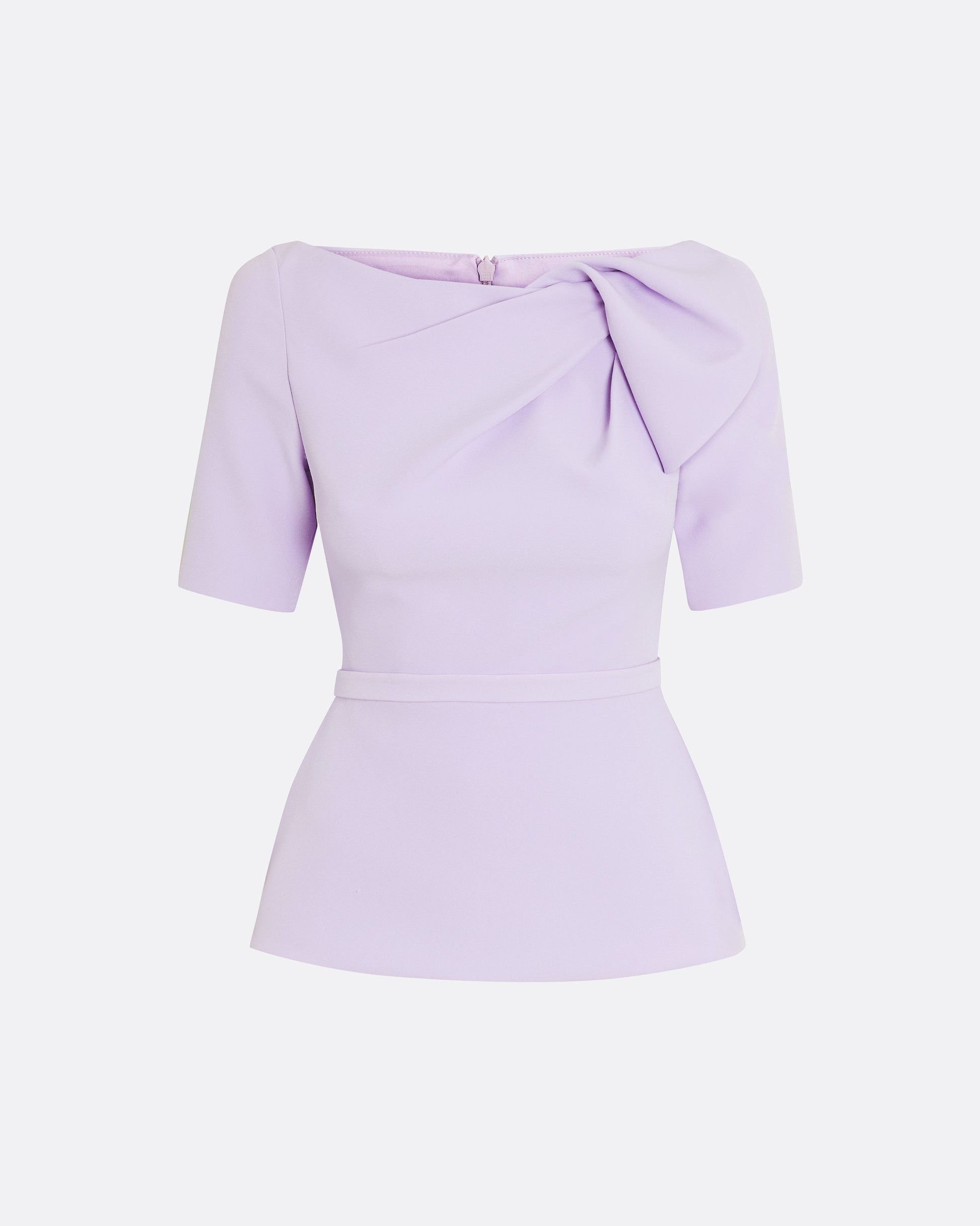 Three quarter length sleeved top with simple peplum and architectural drape in verbena Heavy Crepe.