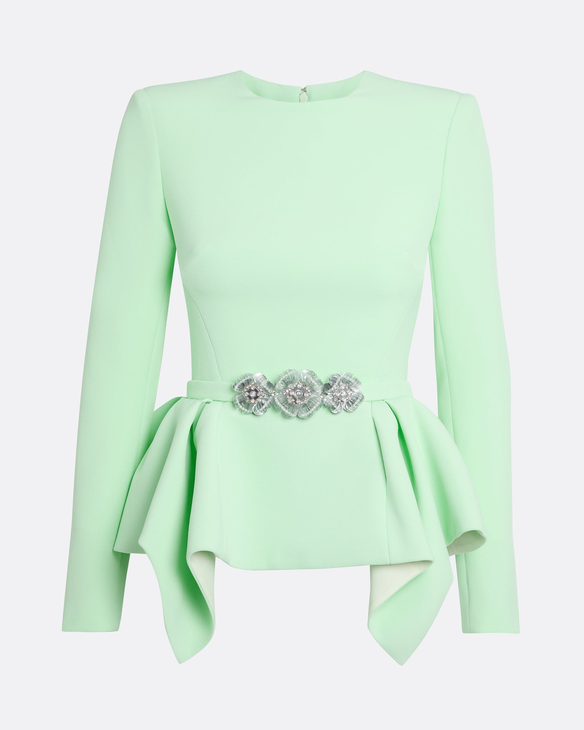 From the Autumn Winter '25 collection, the Midori top in brook green captures light through precise lines and sculptural volume, shaped to accentuate movement with a refined sensibility.