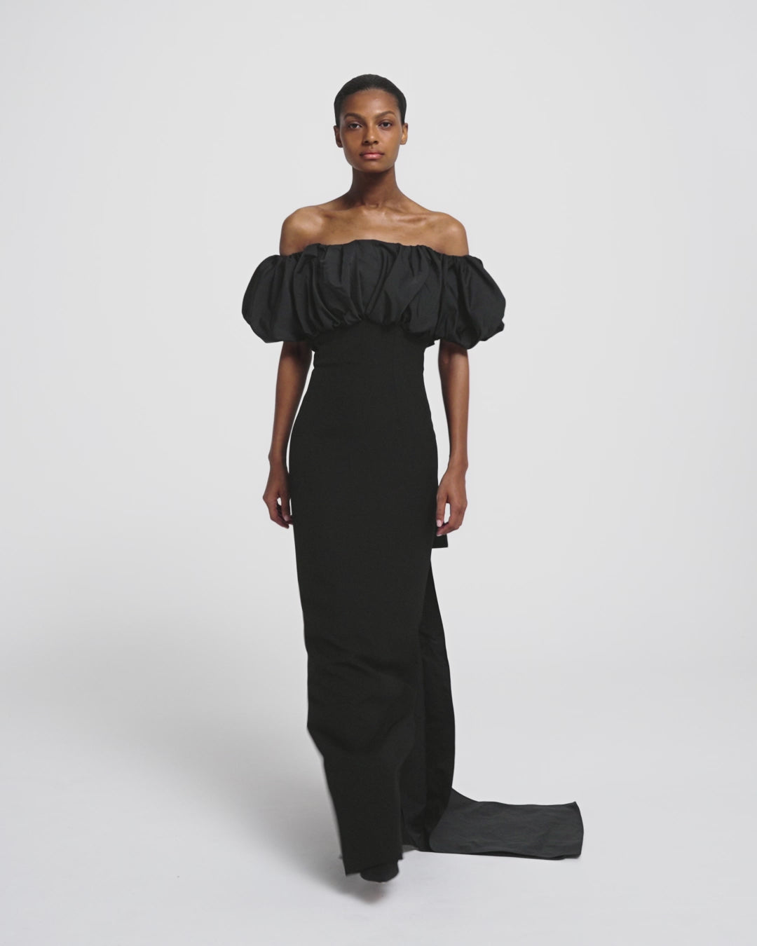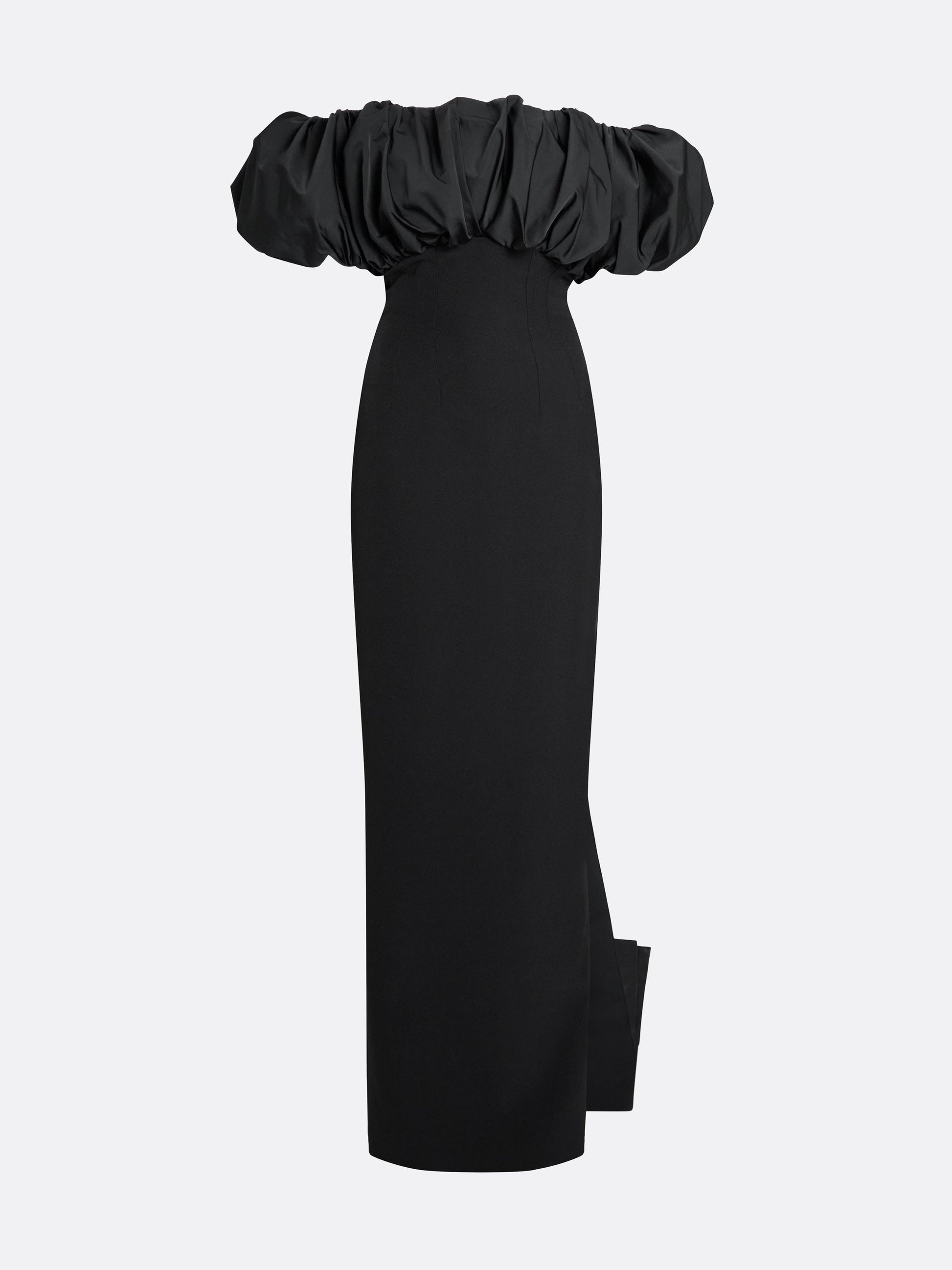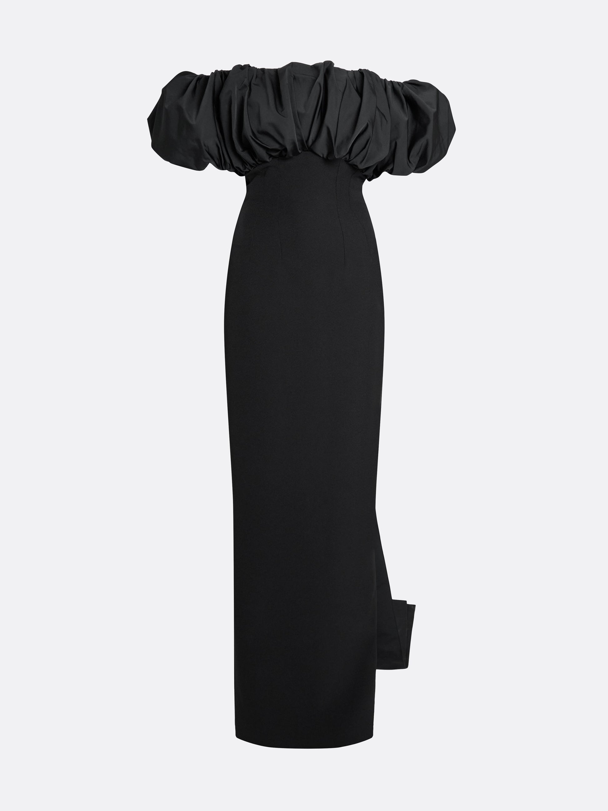 Statement column gown with bust drape and layered bow back detail in black.