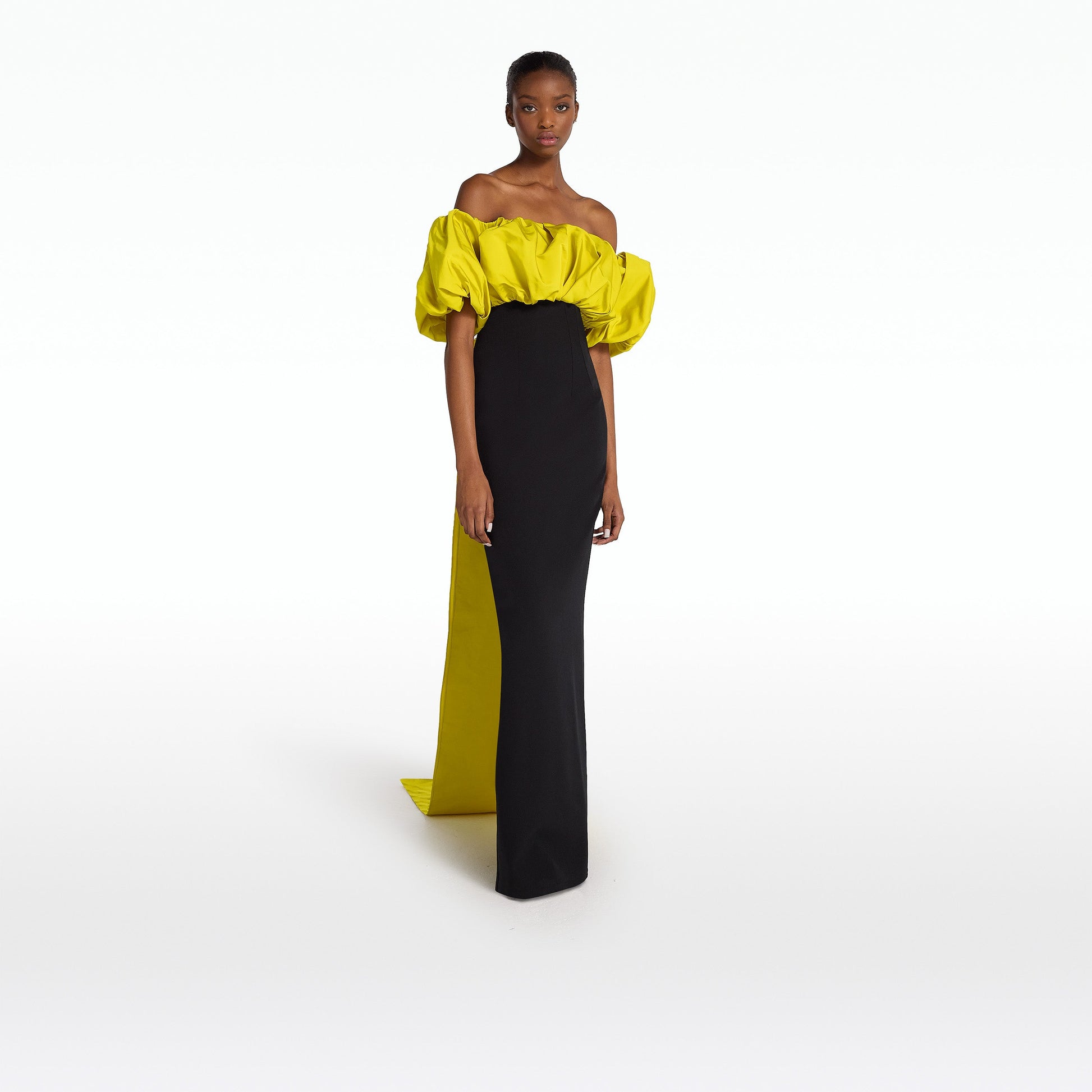 Statement column gown with bust drape and layered bow back detail in chartreuse Faille on black Heavy Crepe.
