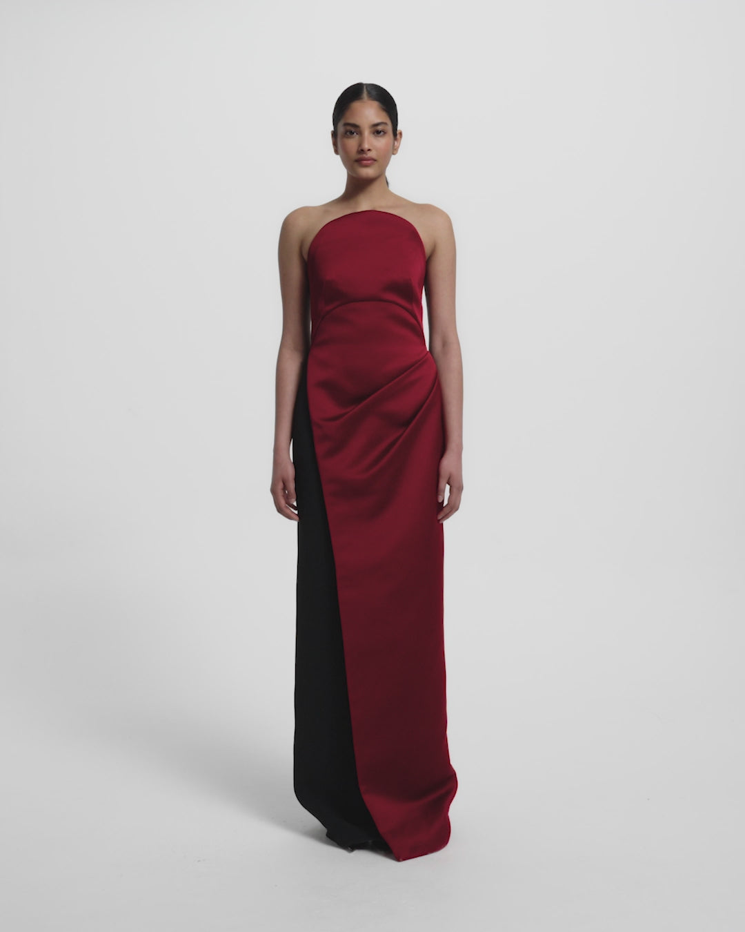 From the Autumn Winter '25 collection, the Misaki dress in swinton on black commands attention through sharp contrast and architectural precision. Its asymmetric front slit and pleated waist detail bring definition to the strapless design, lending structure to softness.
