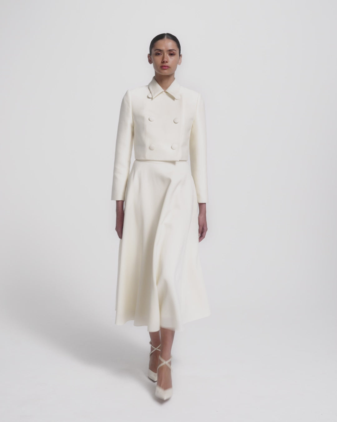 From the Bridal ’26 collection, the Miwa skirt in eggshell captures movement with refined ease. Generous pleating flows through a voluminous cut, offering a statement of understated drama.