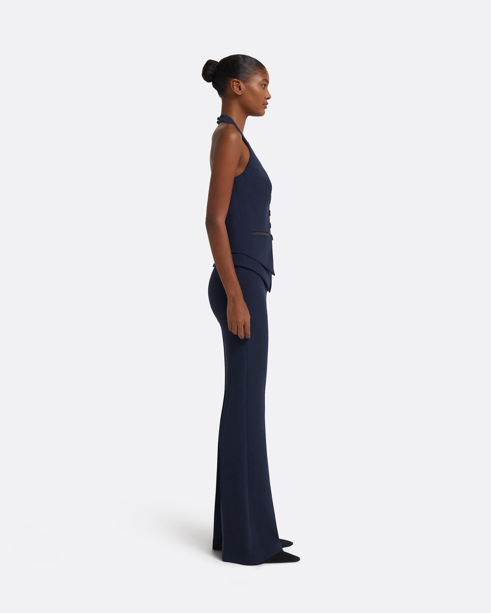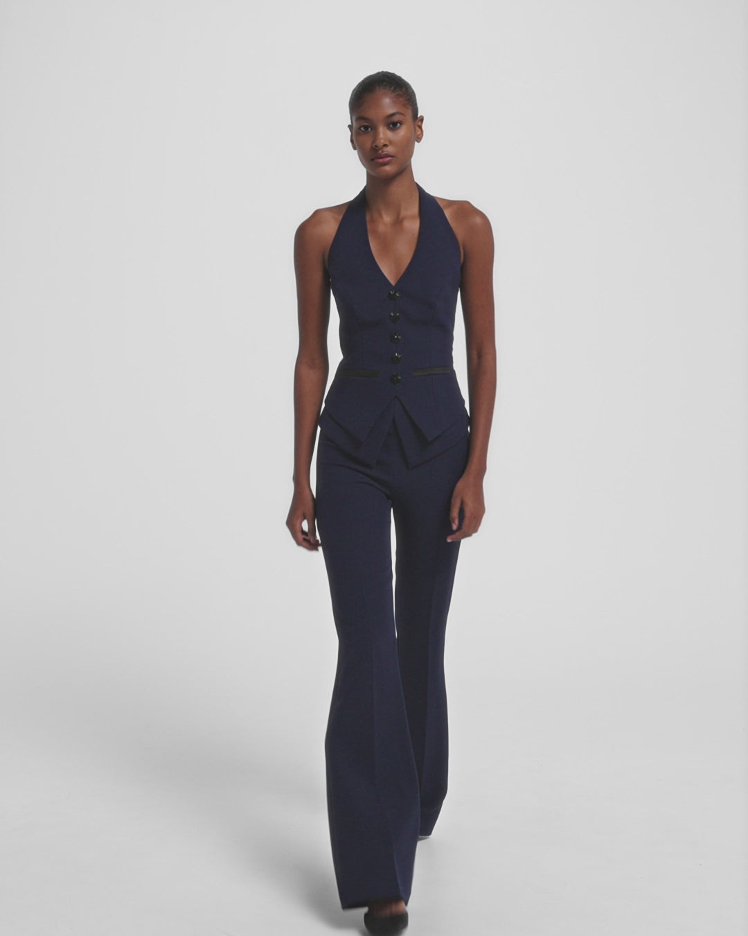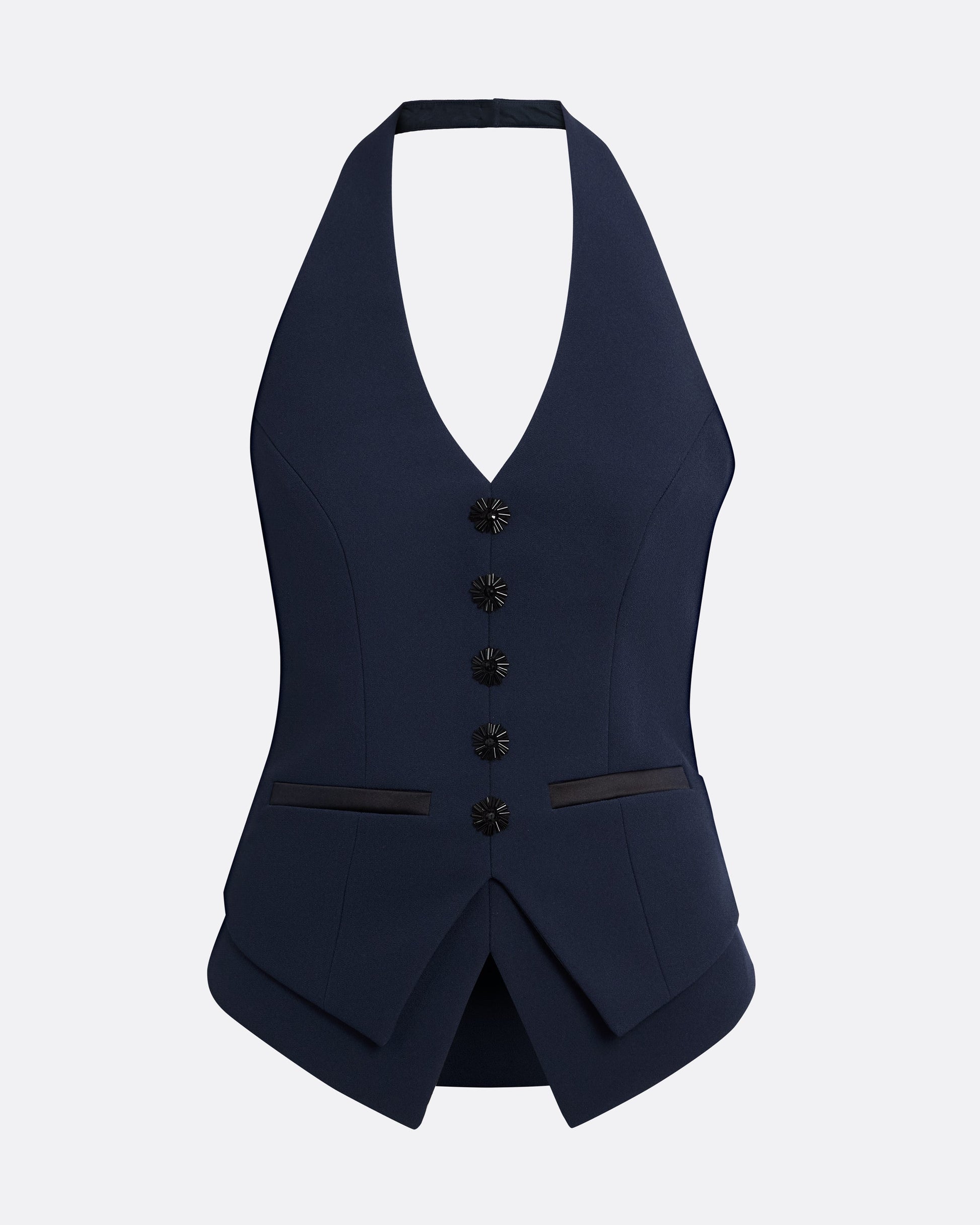 From the Resort ’26 collection, the Nathalia top redefines tailoring through a feminine lens. Cut in structured crepe, it features a halter neckline and deep V front, with embroidered buttons and sharp lapel-inspired detailing at the waist that echo classic codes.