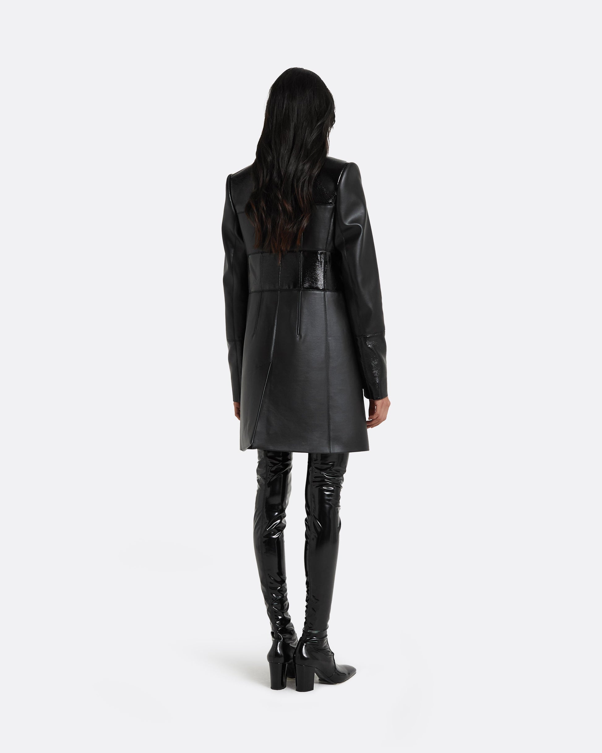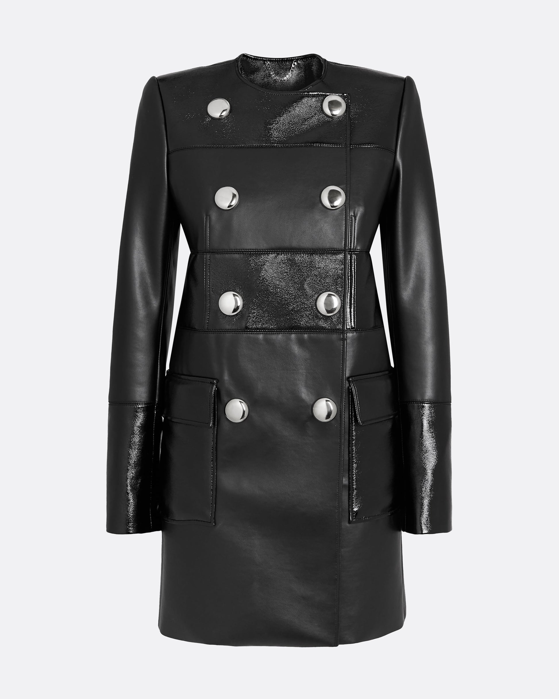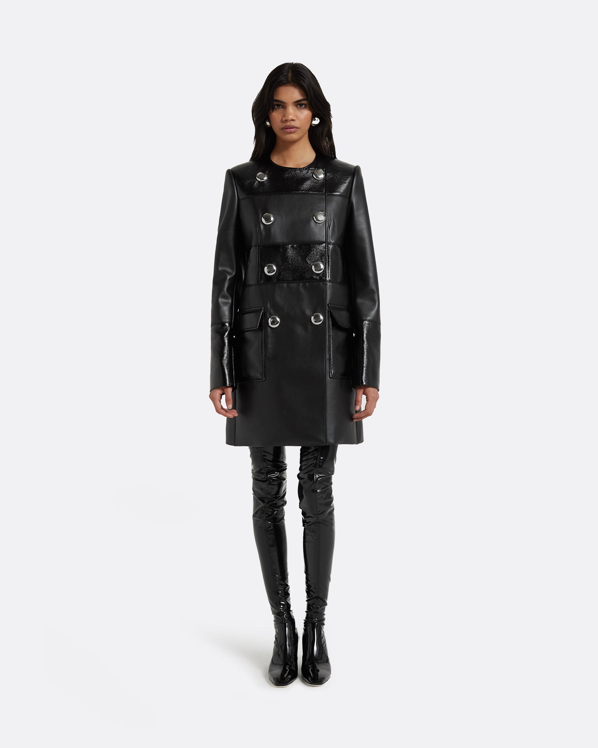 Leather contrast, button detailed coat in black High Shine PU and Cactus Vegan Leather.