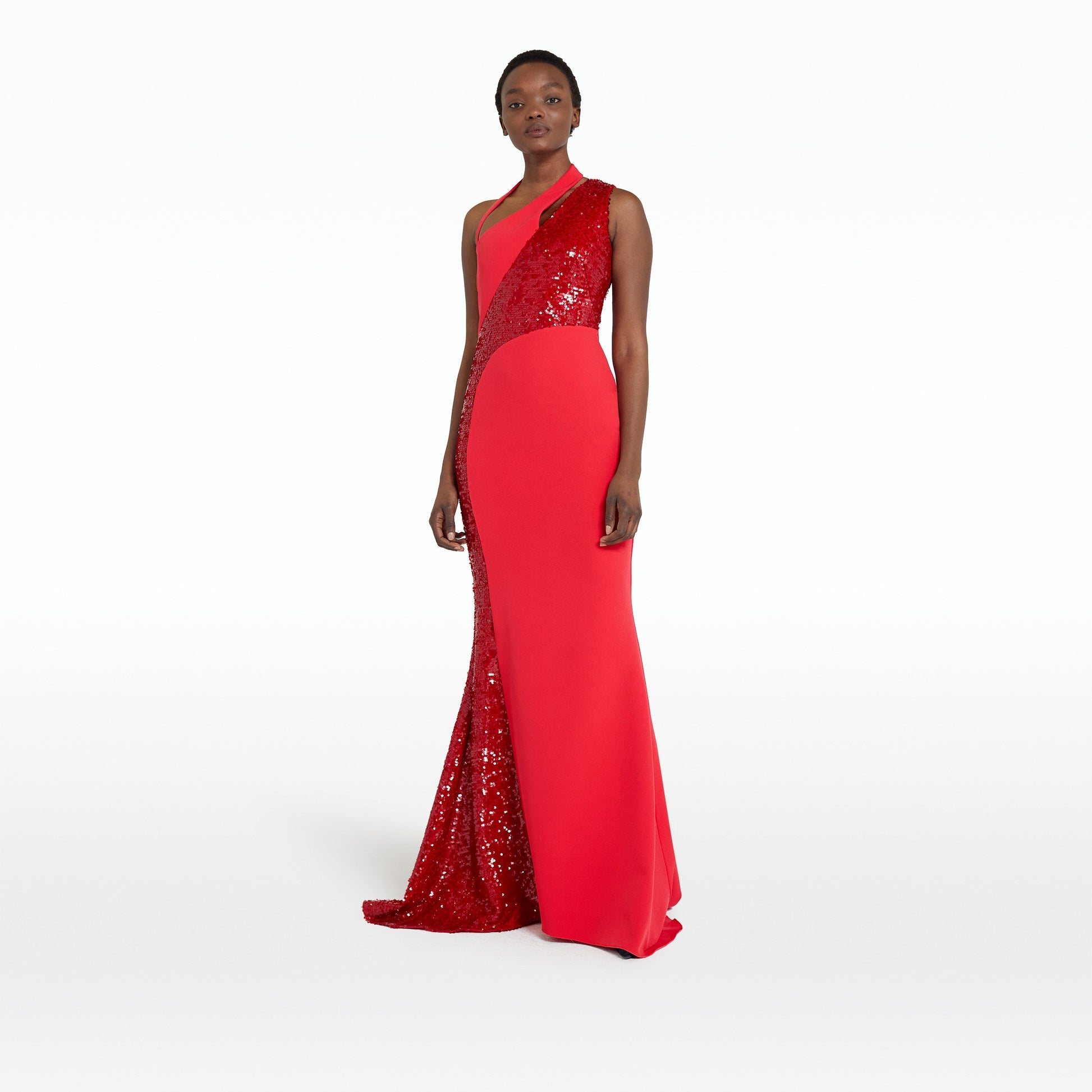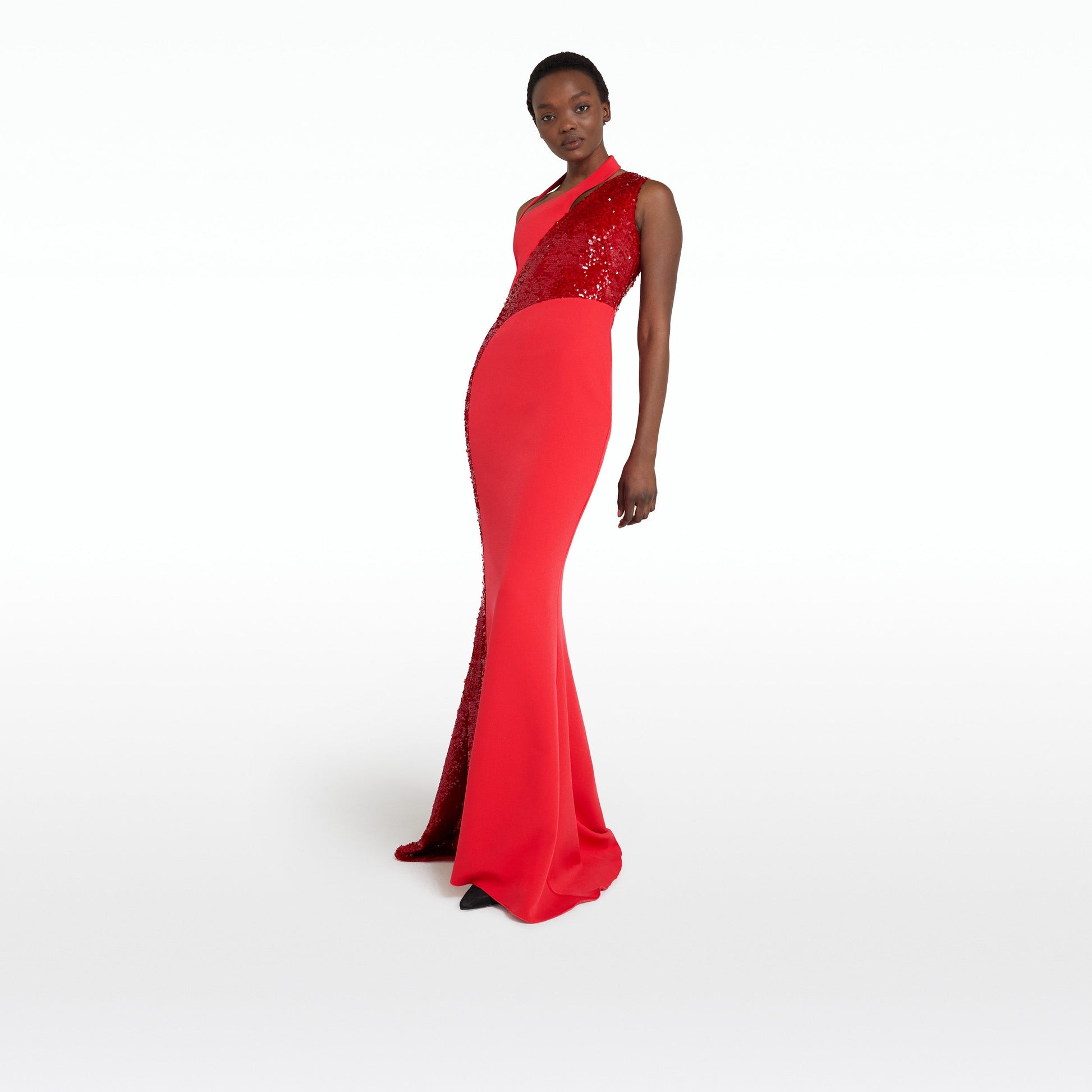 Long dress with fishtail skirt, contrast detailing and asymmetric neckline in lollipop Heavy Crepe and Fluid Sequins.