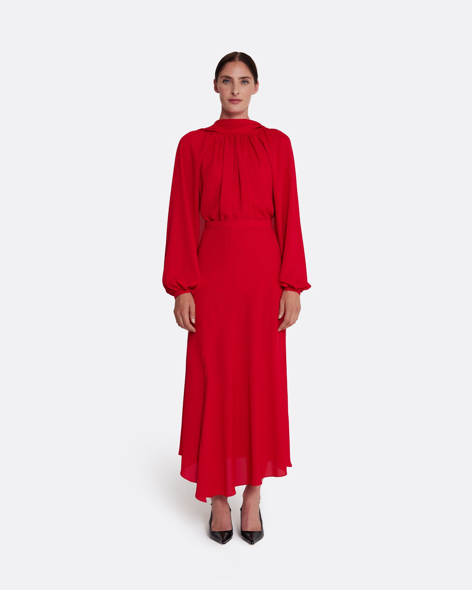 From the Spring Summer ’26 collection, the Olimpia Skirt in azalea red offers a structured approach to fluidity. Fitted through the waist and hips before softening into a flared hem, the shape creates a refined sense of motion.