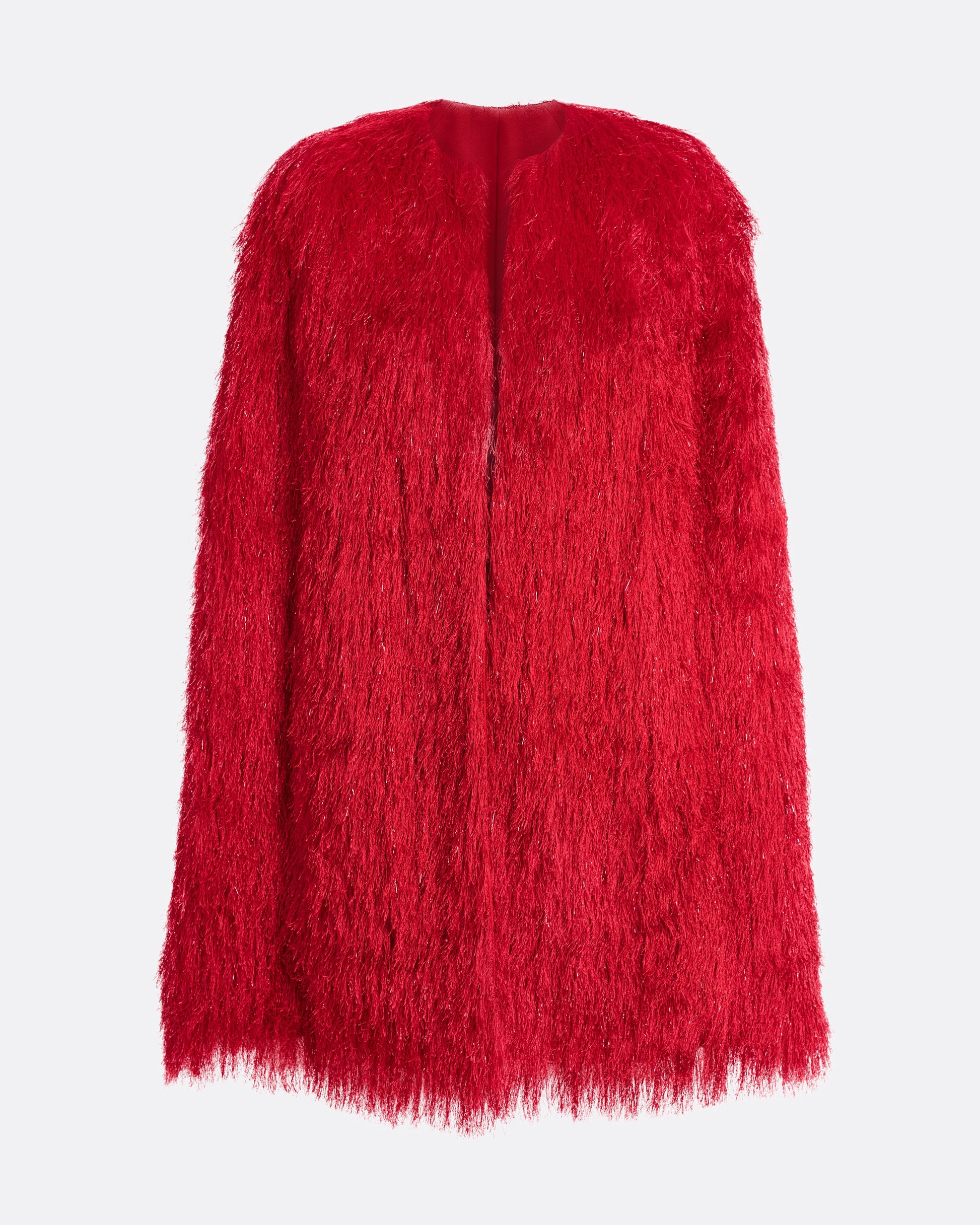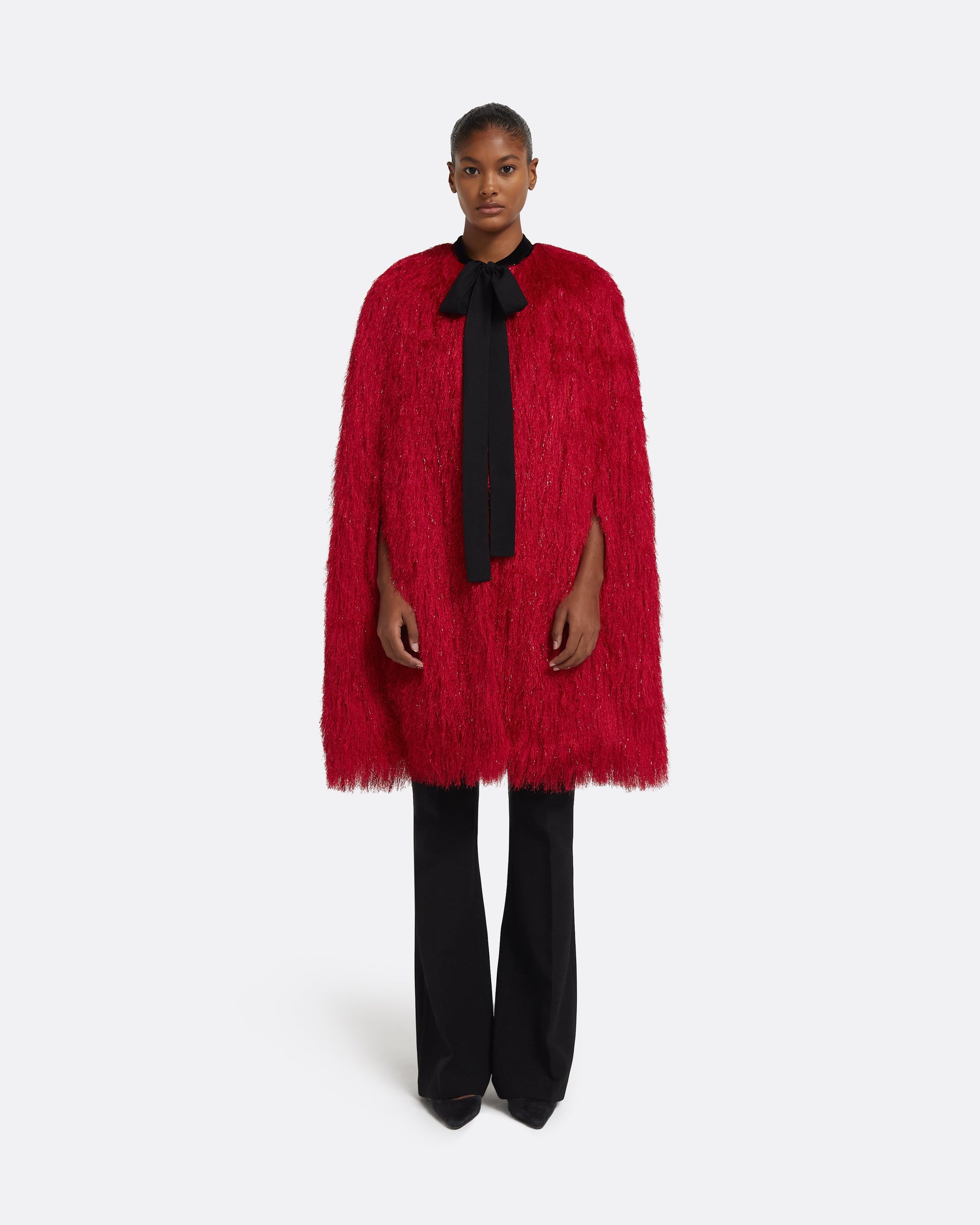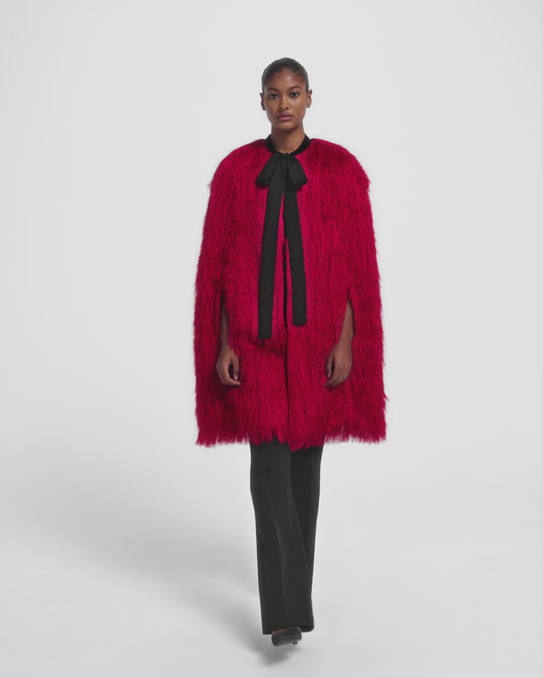 From the Resort ’26 collection, the Ollie cape in crimson makes a bold statement with its voluminous texture and clean lines. Cut in a cloak shape with front slits for the arms, it balances drama with structure.