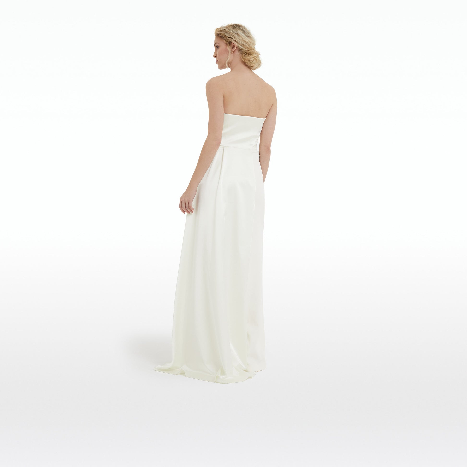 Strapless, wide leg jumpsuit with front foldover, floor length drape detail in ivory Shine Satin Stretch. Item fully lined.