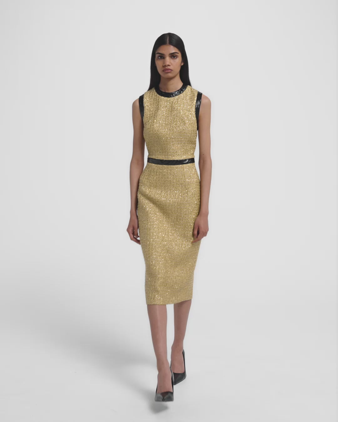From the Resort ’26 collection, the Peyton midi dress in black on yellow gold offers a contemporary take on classic tailoring. Framed with contrasting black details at the collar, shoulders and waist, the fitted cut enhances the structured texture of the fabric.