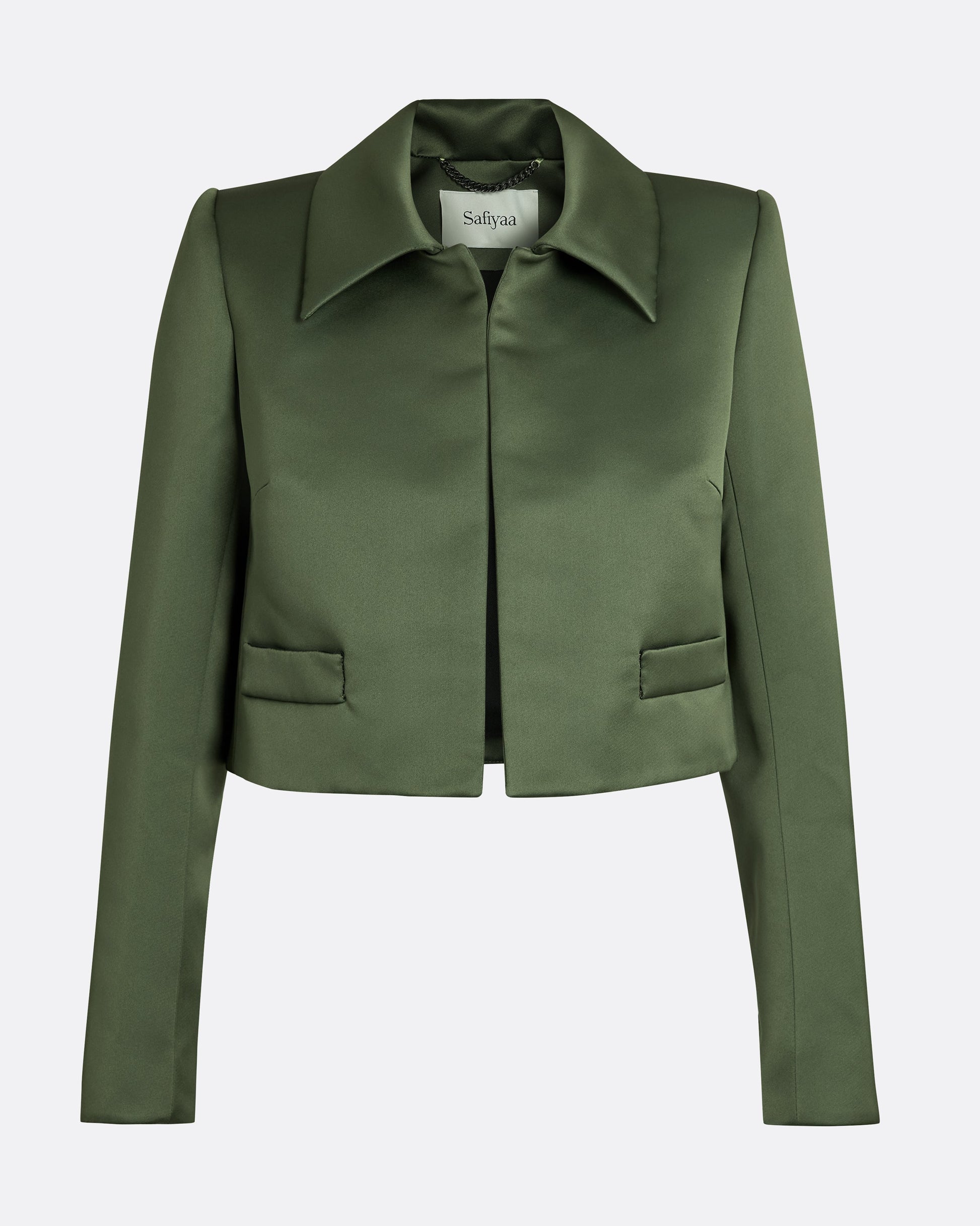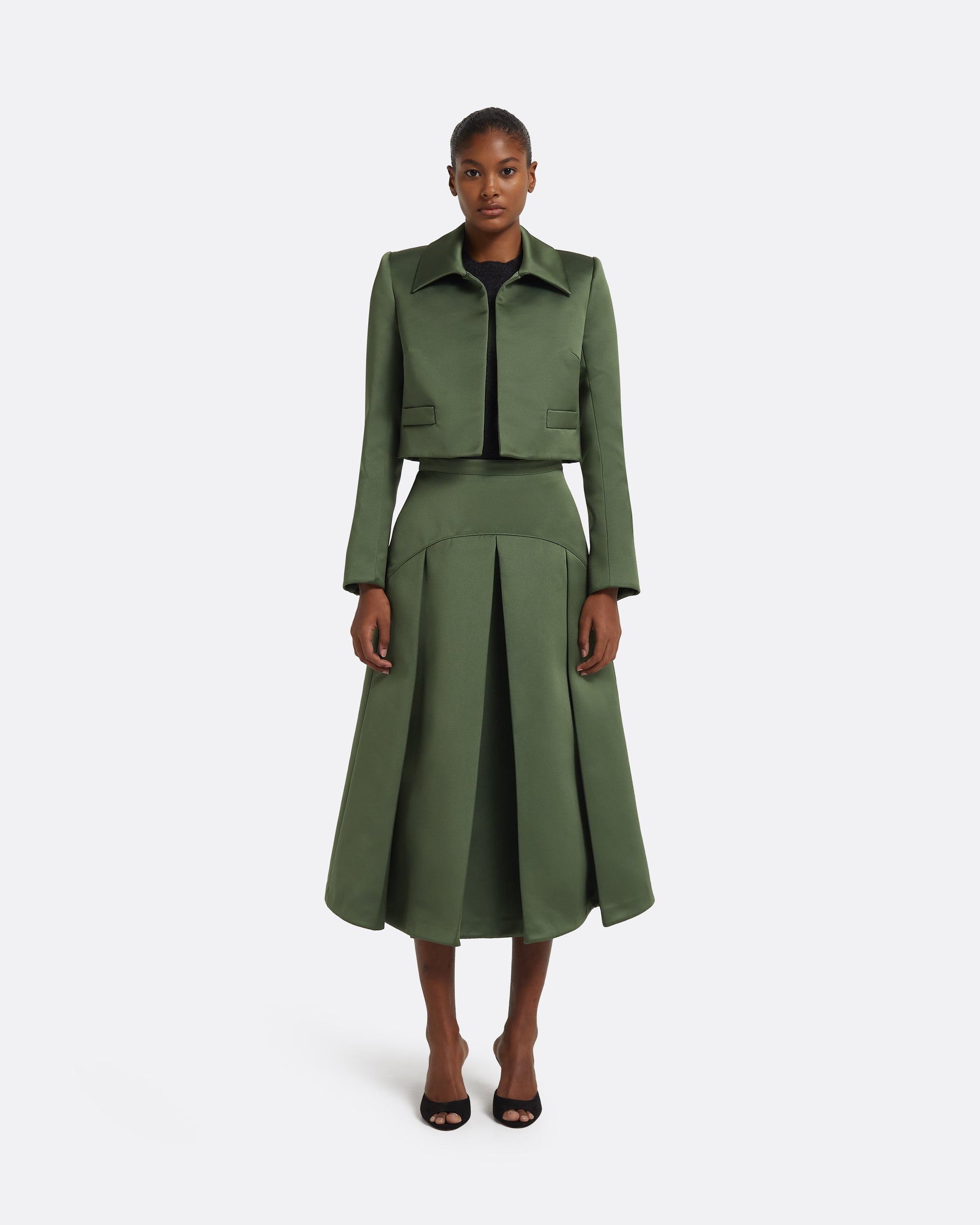 From the Resort ’26 collection, the Phoenix jacket in moss green introduces a sculptural layer to tailored separates. The cropped, boxy cut lends a modern edge to its refined simplicity.