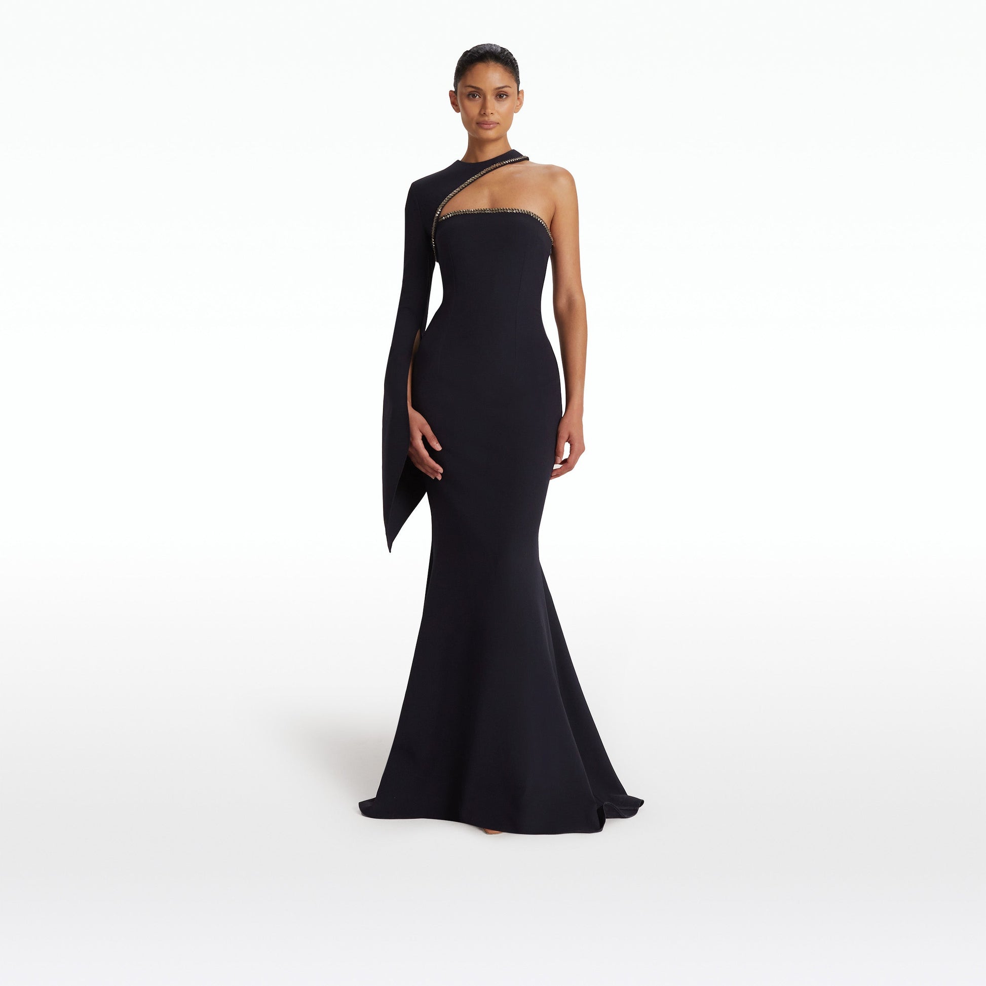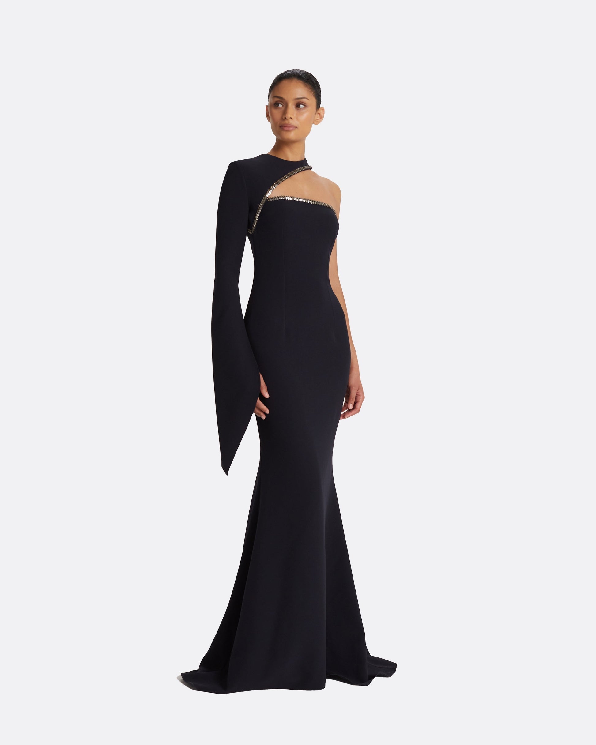 Round neck, gown with single, open flare sleeve in midnight navy Heavy Crepe with gunmetal Mirror Disc embroidery.