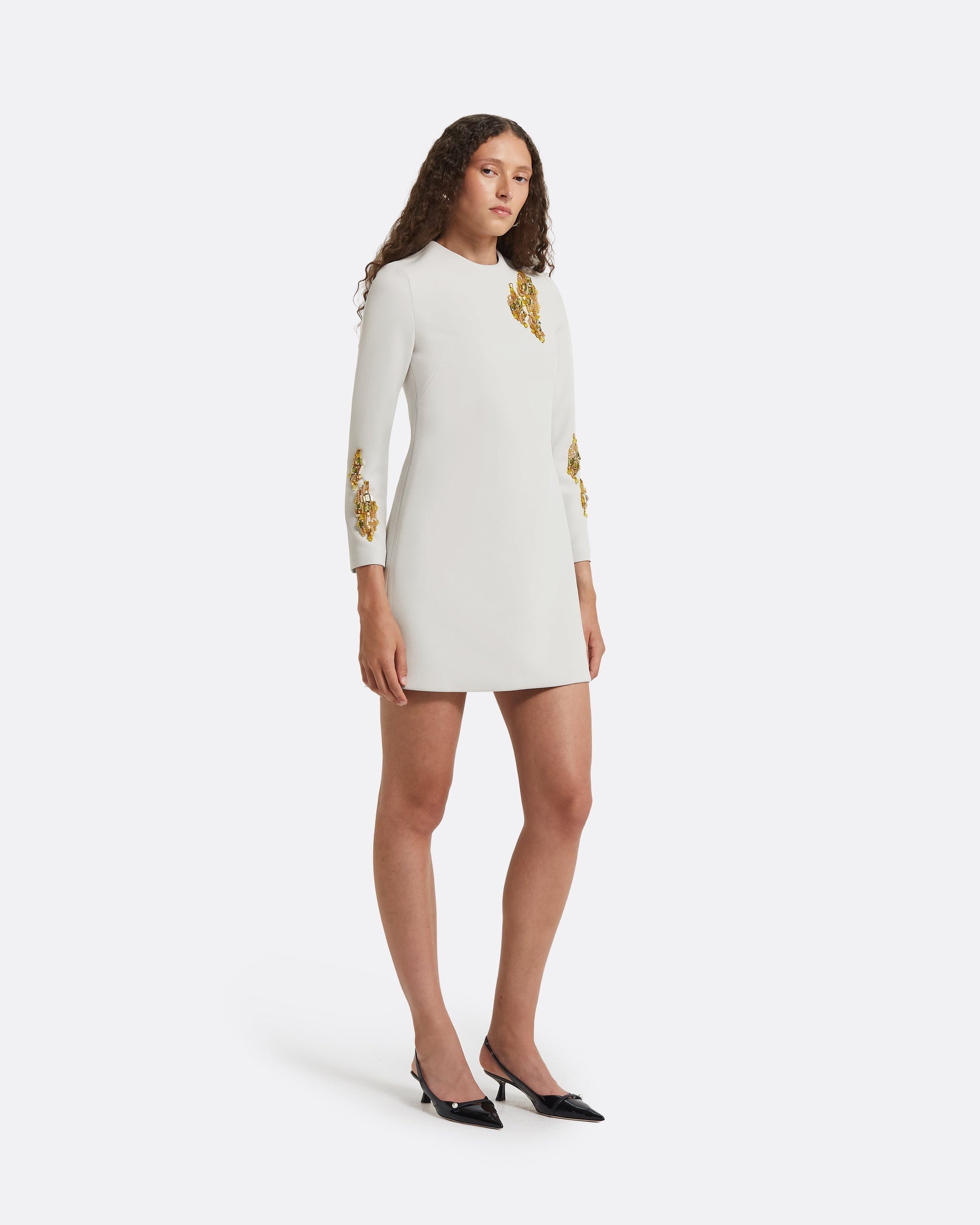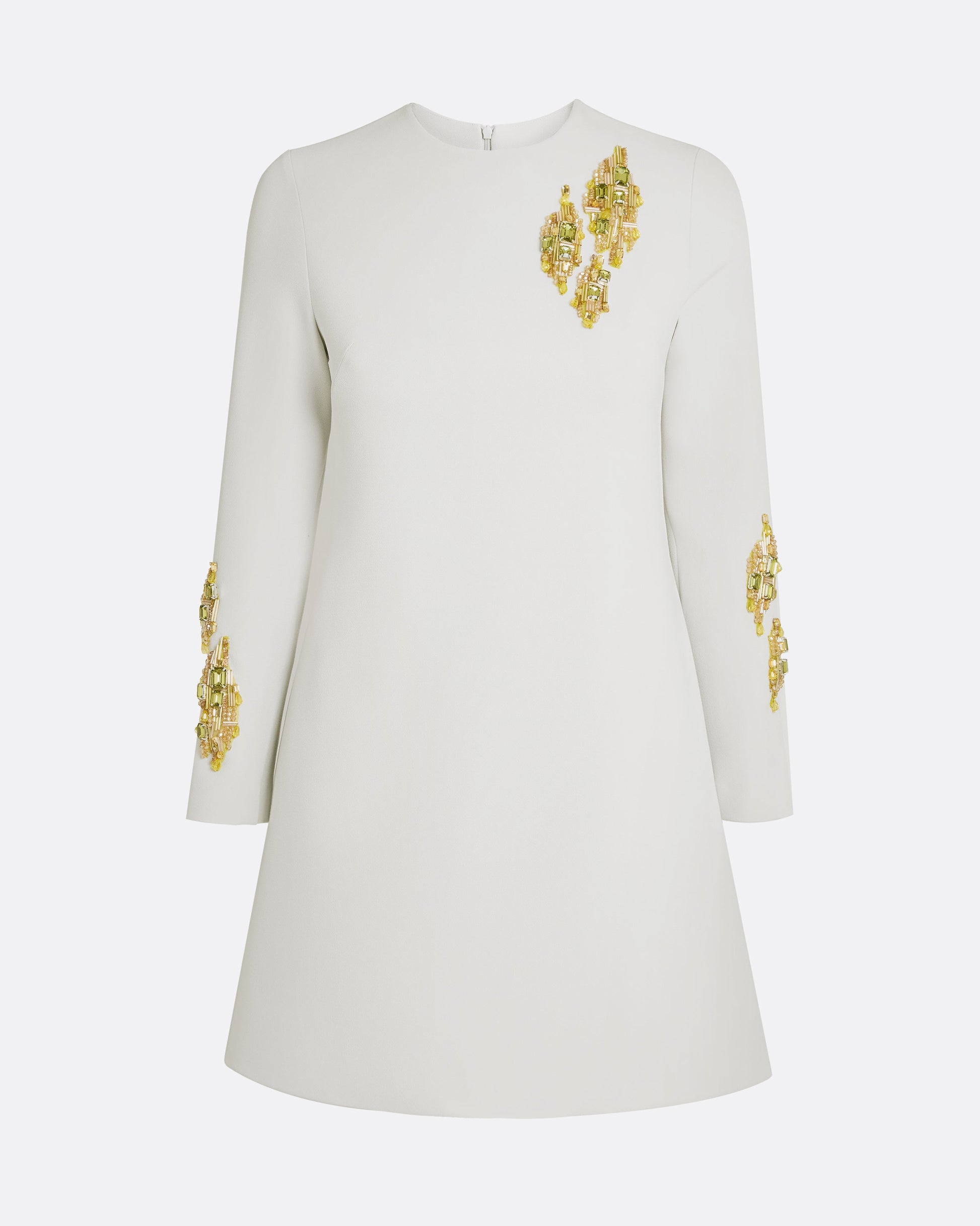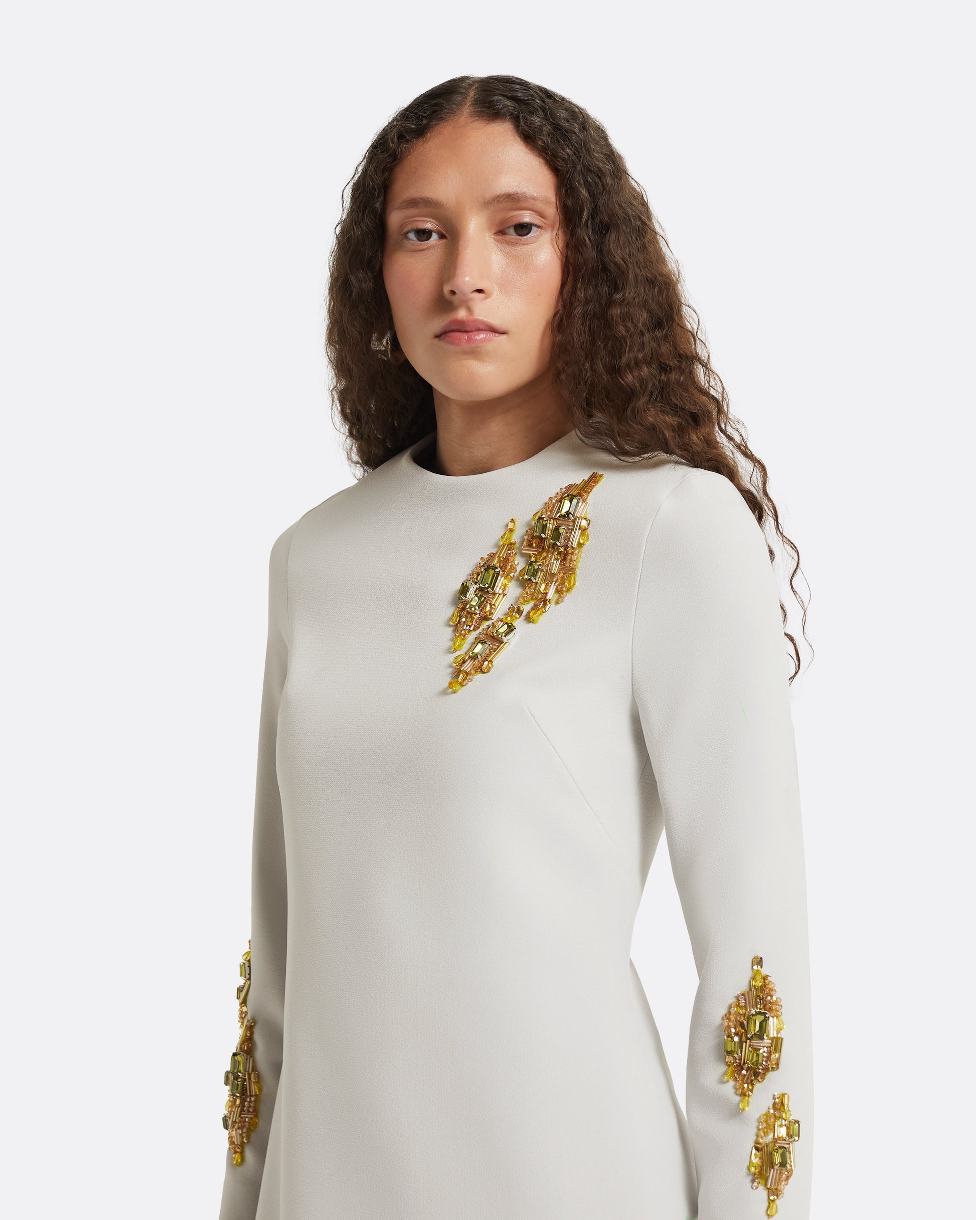 Mini A-line shift dress with long sleeve in stone grey Heavy Crepe with multi-chartreuse Margarita embroidery.