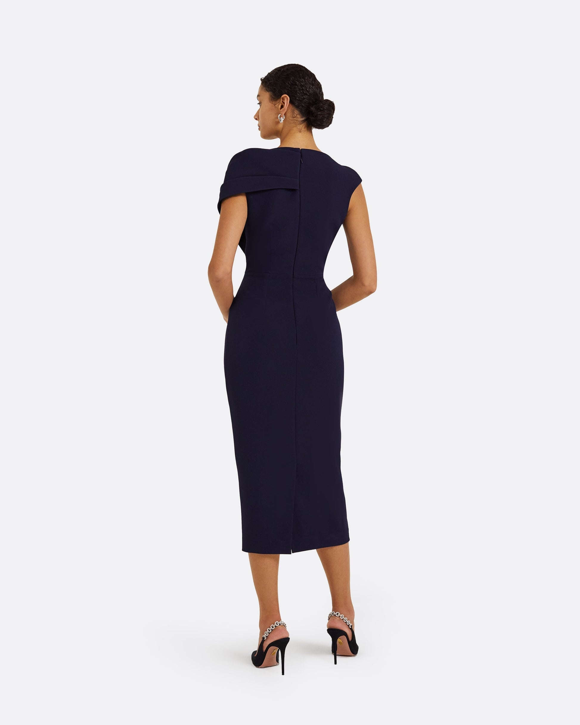 Boat neck, cap sleeved dress with cross body drape in azurite blue.
